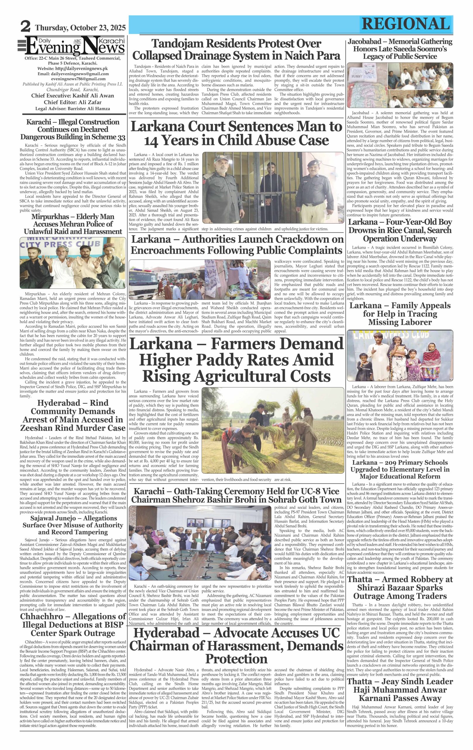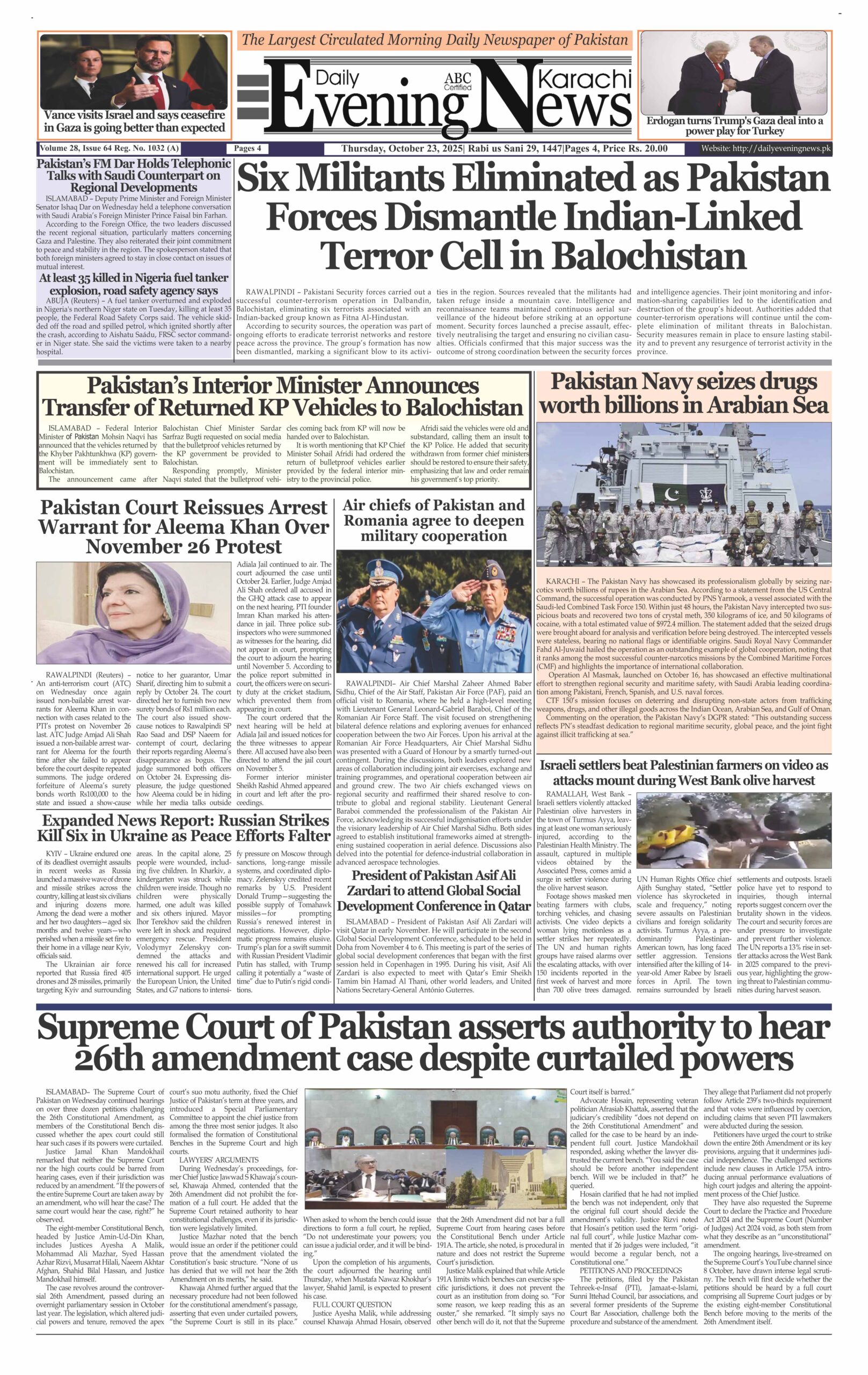 ePaper Thursday October 23, 2025 By: admin Date: October 23, 2025 DOWNLOAD ePaper TagsDaily EnglishDaily Evening Newsepaper Previous articleATC Reissues Arrest Warrant for Aleema Khan in November 26 Protest CaseNext articleInternational Court: Israel Must Allow Humanitarian Aid into Gaza adminhttps://dailyeveningnews.pk LEAVE A REPLY Cancel reply Comment: Please enter your comment! Name:* Please enter your name here Email:* You have entered an incorrect email address! Please enter your email address here Website: Save my name, email, and website in this browser for the next time I comment. Share post: FacebookTwitterPinterestWhatsApp SubscribeI want inI've read and accept the Privacy Policy. Popular Lebanon Says President Will Not Speak to Israeli PM Netanyahu Pope Leo Warns World Controlled by ‘Cruel Leaders’ Israeli Airstrikes Destroy Last Bridge Linking South Lebanon PSL 11: Hyderabad Kings Beat Rawalpindi by 5 Wickets Pakistan to Reduce Power Load Shedding From Tonight: Federal Minister More like thisRelated Lebanon Says President Will Not Speak to Israeli PM Netanyahu admin - April 16, 2026 Beirut, Lebanon – Web Desk: Lebanese authorities have confirmed... Pope Leo Warns World Controlled by ‘Cruel Leaders’ admin - April 16, 2026 Yaoundé, Cameroon – Web Desk: Catholic Church leader Pope... Israeli Airstrikes Destroy Last Bridge Linking South Lebanon admin - April 16, 2026 Beirut, Lebanon – Web Desk: Israeli airstrikes have destroyed... PSL 11: Hyderabad Kings Beat Rawalpindi by 5 Wickets admin - April 16, 2026 Karachi, Pakistan – Web Desk: In the 11th edition...