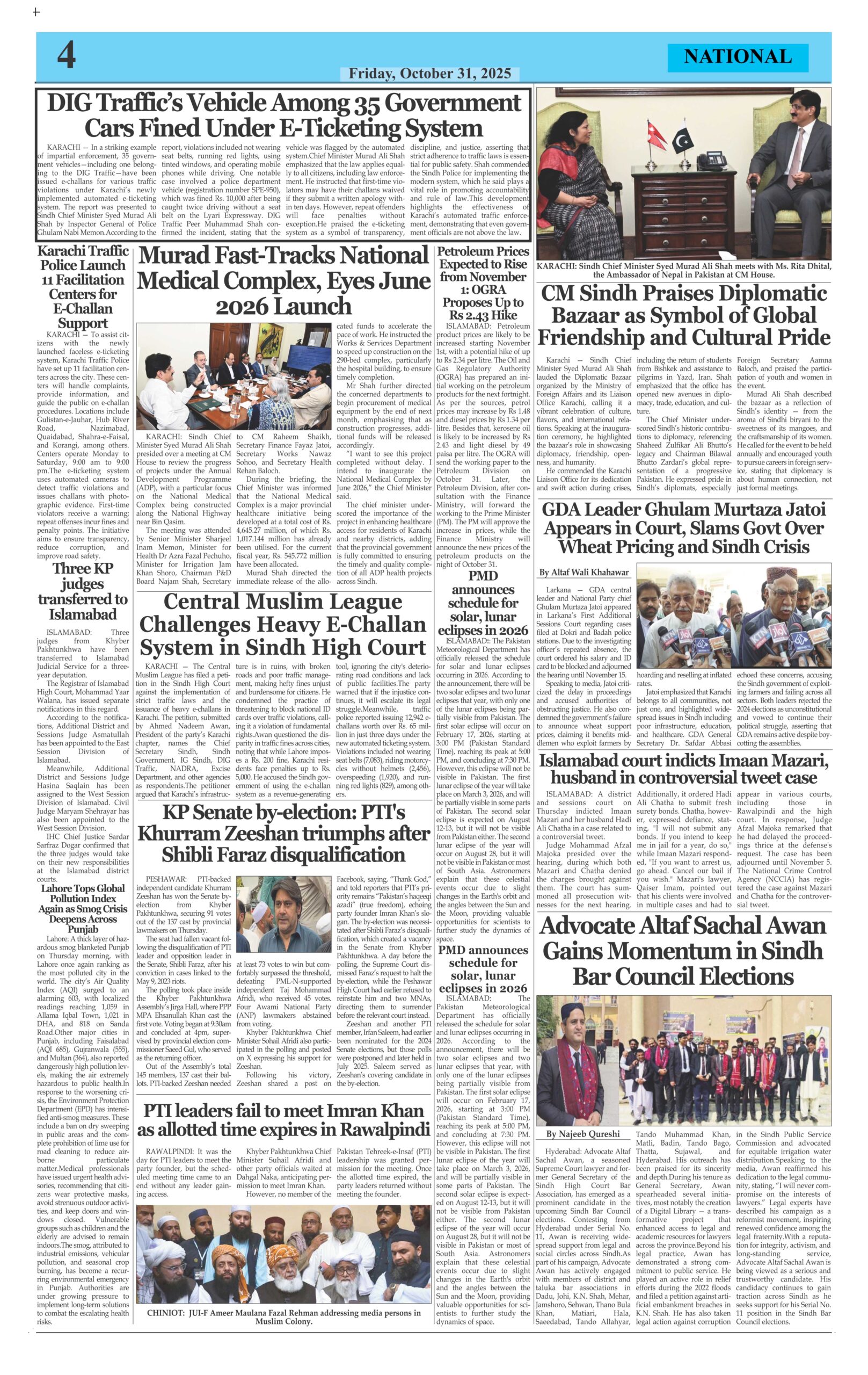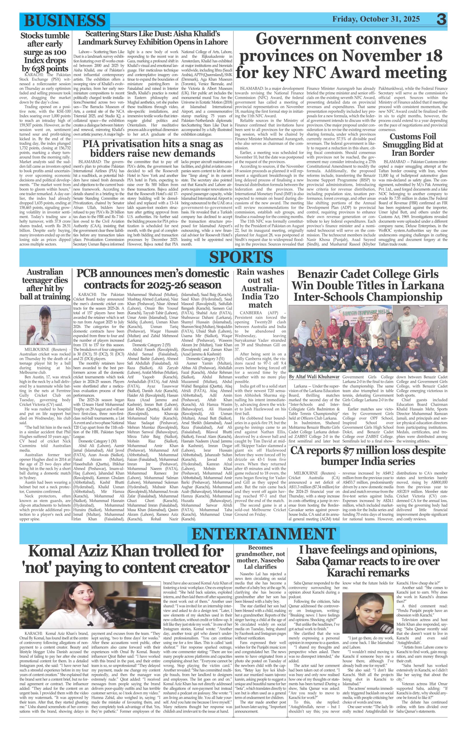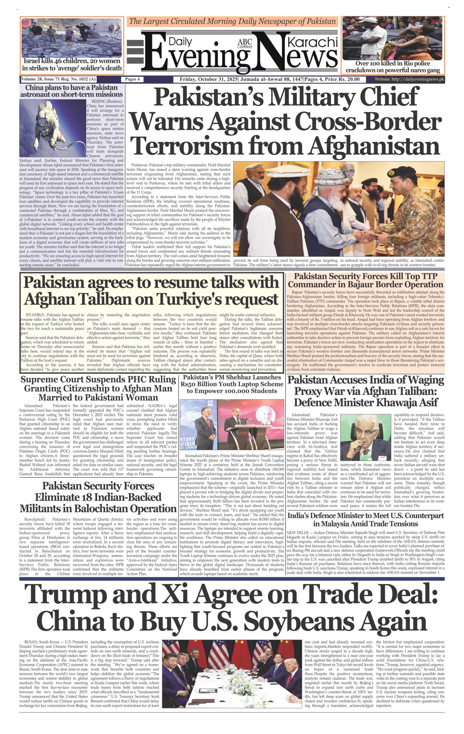 ePaper By: admin Date: October 31, 2025 Previous articlePakistan’s Military Chief Warns Against Cross-Border Terrorism from AfghanistanNext articleSaudi Arabia shortens Umrah visa validity to one month. adminhttps://dailyeveningnews.pk LEAVE A REPLY Cancel reply Comment: Please enter your comment! Name:* Please enter your name here Email:* You have entered an incorrect email address! Please enter your email address here Website: Save my name, email, and website in this browser for the next time I comment. Share post: FacebookTwitterPinterestWhatsApp SubscribeI want inI've read and accept the Privacy Policy. Popular Security Tightened in Islamabad Ahead of Arrival of Iranian and US Delegations Trump Warns Ceasefire With Iran May End Without Deal Pakistan Names Test Squad for Bangladesh, Sarfaraz Coach Prime Minister Shehbaz Sharif urges pride in Pakistan’s cultural heritage Field Marshal Asim Munir Concludes Iran Visit, Emphasizes Regional Peace and Dialogue More like thisRelated Security Tightened in Islamabad Ahead of Arrival of Iranian and US Delegations admin - April 18, 2026 Islamabad, Pakistan - Web Desk: Security has been significantly... Trump Warns Ceasefire With Iran May End Without Deal admin - April 18, 2026 Washington, United States - Web Desk: US President Donald... Pakistan Names Test Squad for Bangladesh, Sarfaraz Coach admin - April 18, 2026 Lahore, Pakistan - Web Desk: The Pakistan Cricket Board... Prime Minister Shehbaz Sharif urges pride in Pakistan’s cultural heritage admin - April 18, 2026 Islamabad, Pakistan - Web Desk: Prime Minister Shehbaz Sharif...