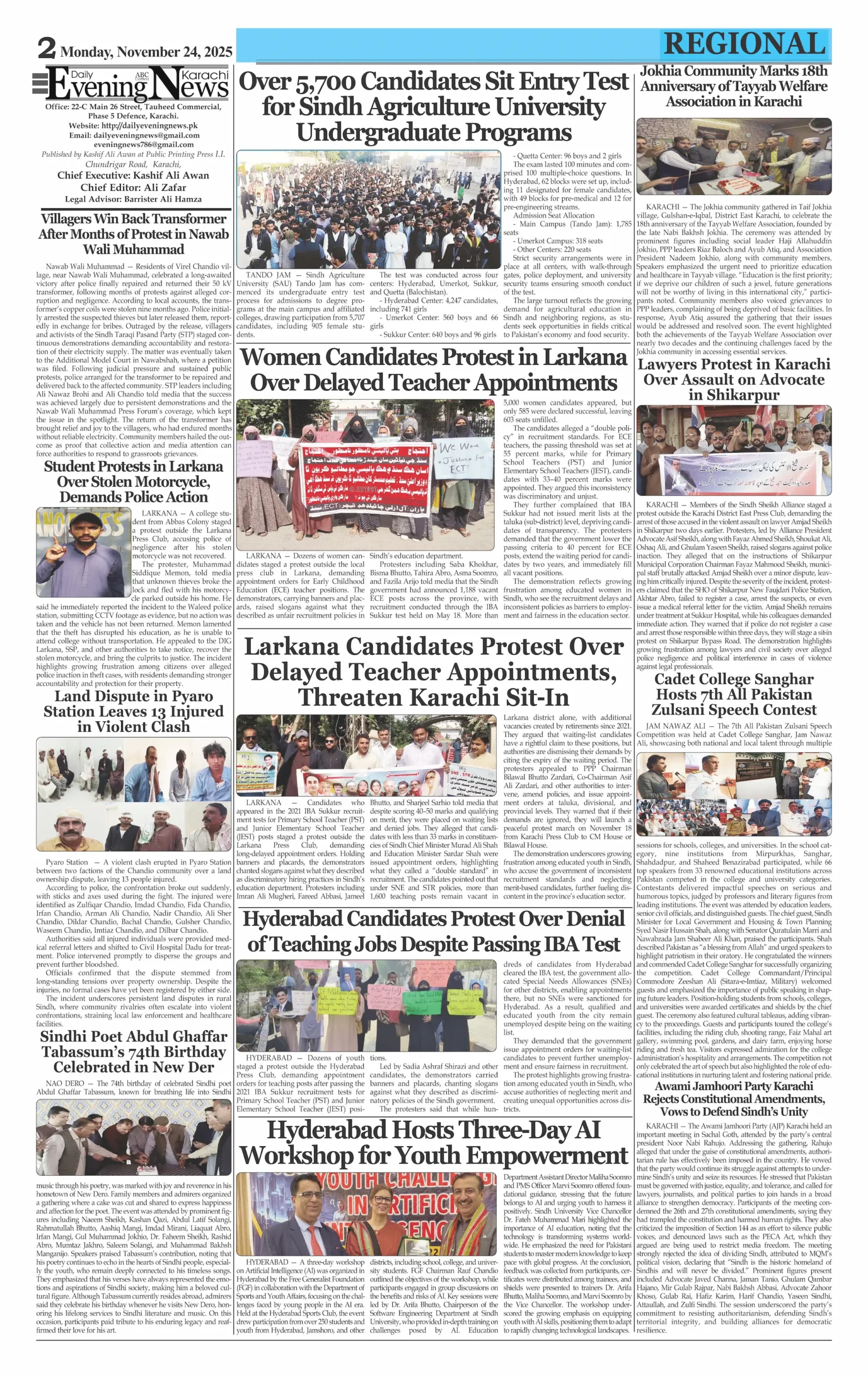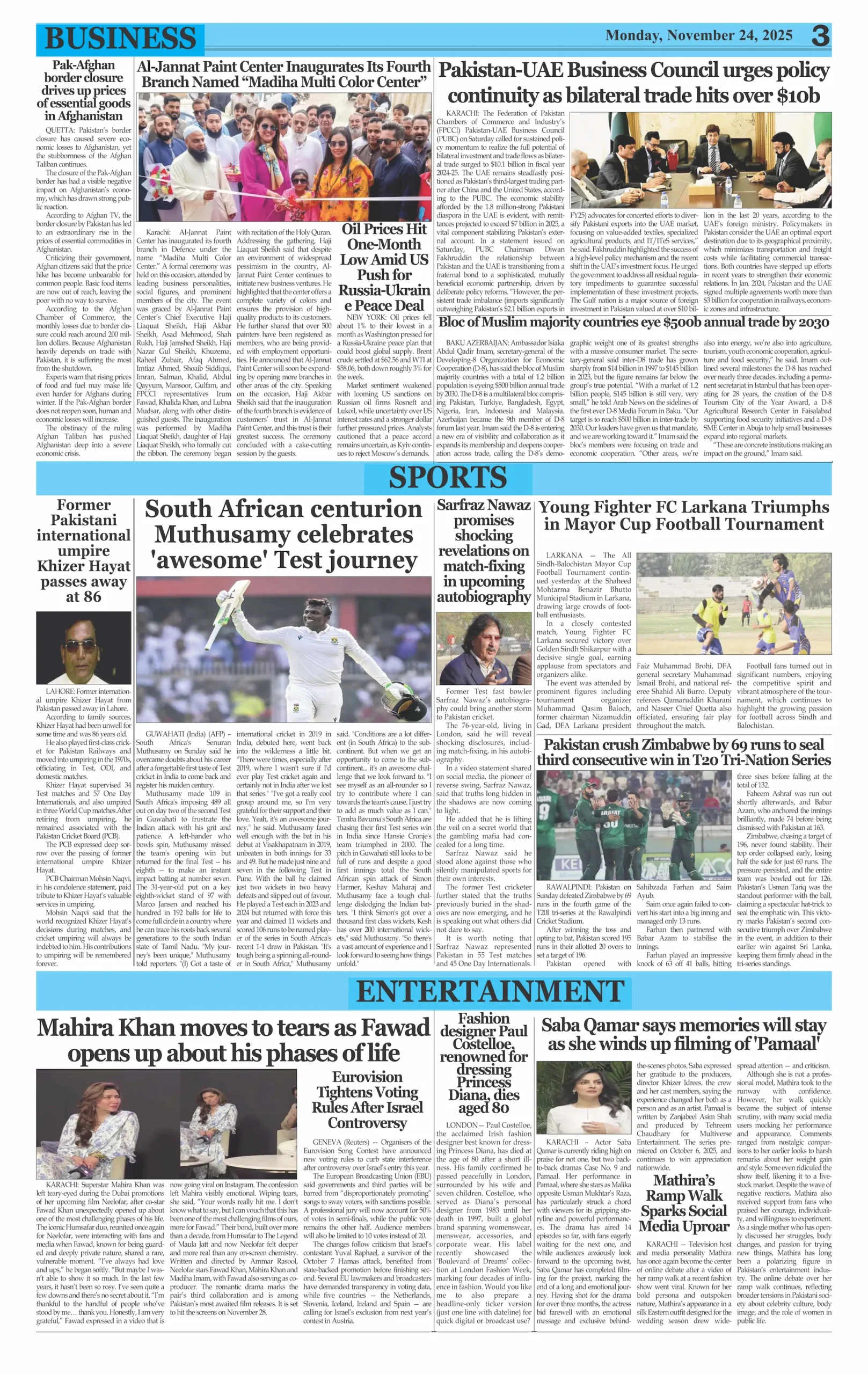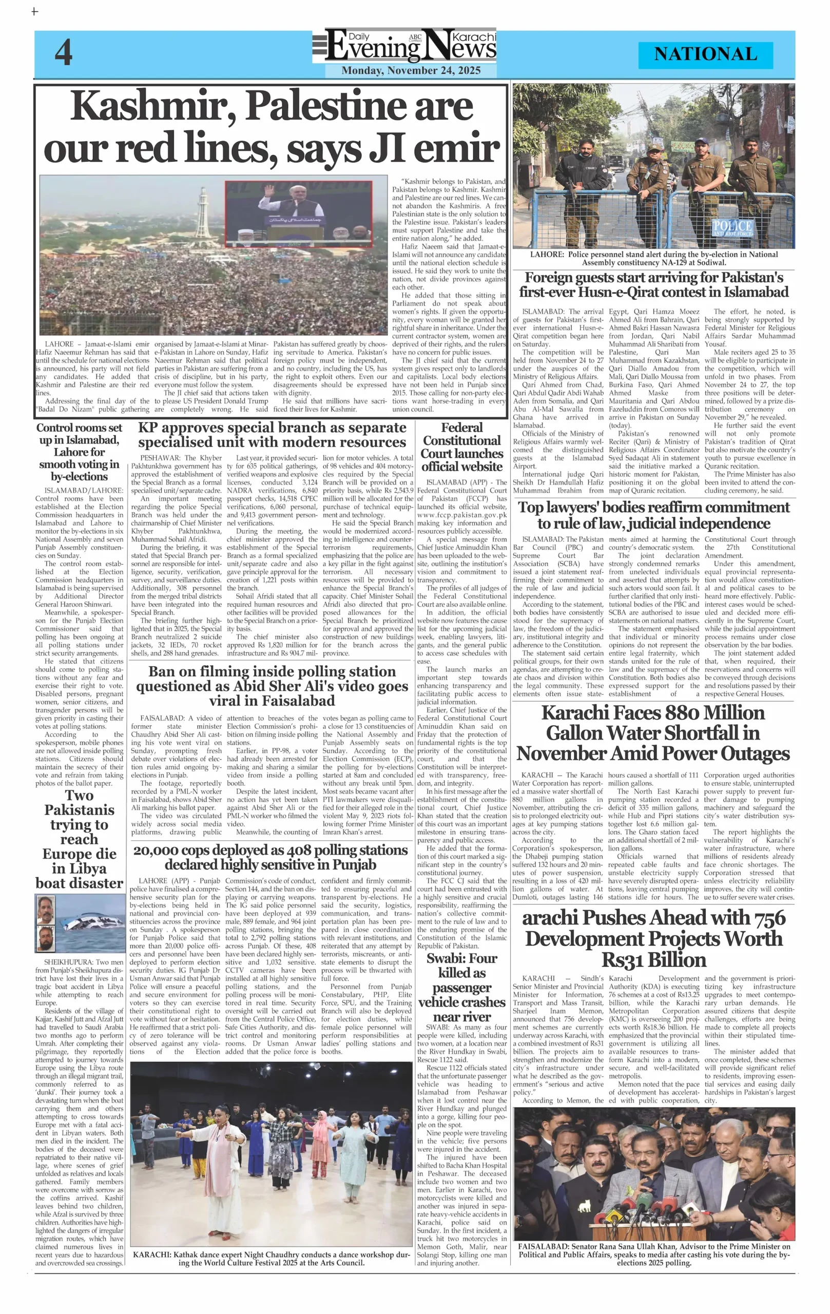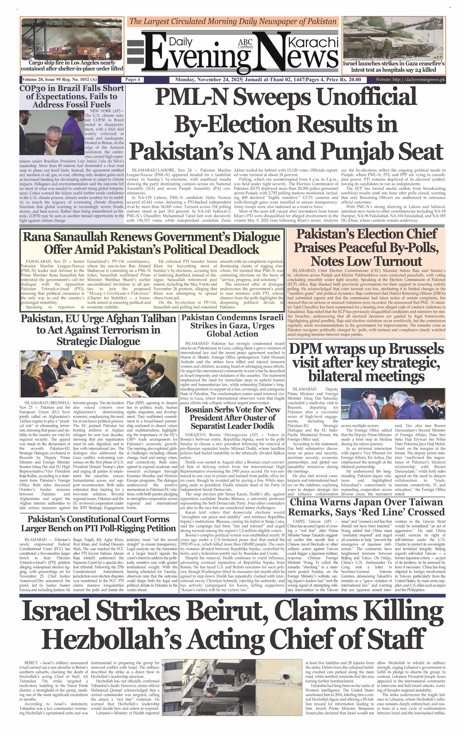 ePaper Monday Novemer 24, 2025 By: admin Date: November 24, 2025 Download ePaper TagsDaily Evening NewsDaily Newspaperepaper Previous articleBy-elections: PML-N secures key victories in National and Punjab Assembly constituenciesNext articleFC HQ attack thwarted; 3 soldiers, 3 terrorists dead adminhttps://dailyeveningnews.pk LEAVE A REPLY Cancel reply Comment: Please enter your comment! Name:* Please enter your name here Email:* You have entered an incorrect email address! Please enter your email address here Website: Save my name, email, and website in this browser for the next time I comment. Share post: FacebookTwitterPinterestWhatsApp SubscribeI want inI've read and accept the Privacy Policy. Popular Lebanon Says President Will Not Speak to Israeli PM Netanyahu Pope Leo Warns World Controlled by ‘Cruel Leaders’ Israeli Airstrikes Destroy Last Bridge Linking South Lebanon PSL 11: Hyderabad Kings Beat Rawalpindi by 5 Wickets Pakistan to Reduce Power Load Shedding From Tonight: Federal Minister More like thisRelated Lebanon Says President Will Not Speak to Israeli PM Netanyahu admin - April 16, 2026 Beirut, Lebanon – Web Desk: Lebanese authorities have confirmed... Pope Leo Warns World Controlled by ‘Cruel Leaders’ admin - April 16, 2026 Yaoundé, Cameroon – Web Desk: Catholic Church leader Pope... Israeli Airstrikes Destroy Last Bridge Linking South Lebanon admin - April 16, 2026 Beirut, Lebanon – Web Desk: Israeli airstrikes have destroyed... PSL 11: Hyderabad Kings Beat Rawalpindi by 5 Wickets admin - April 16, 2026 Karachi, Pakistan – Web Desk: In the 11th edition...