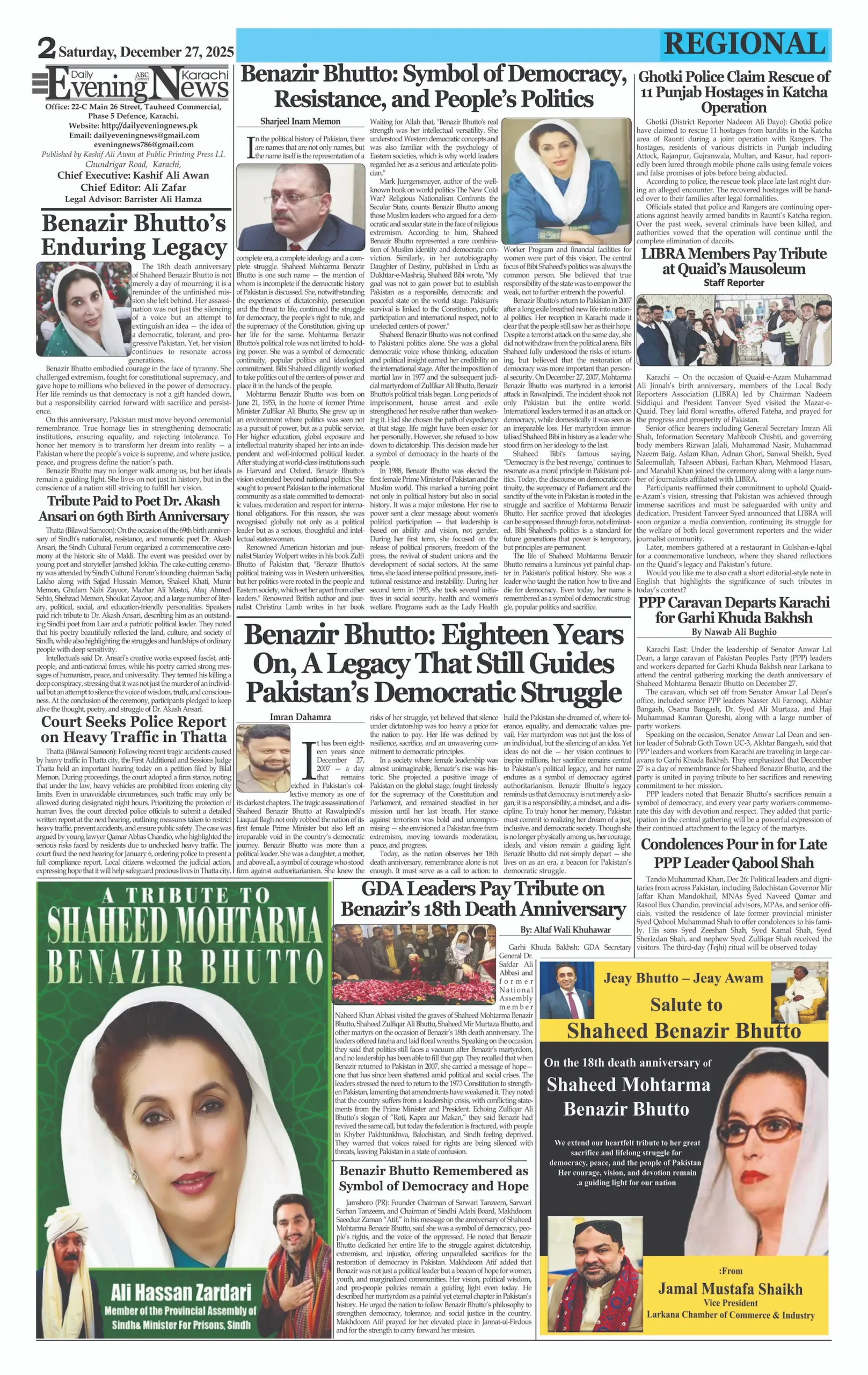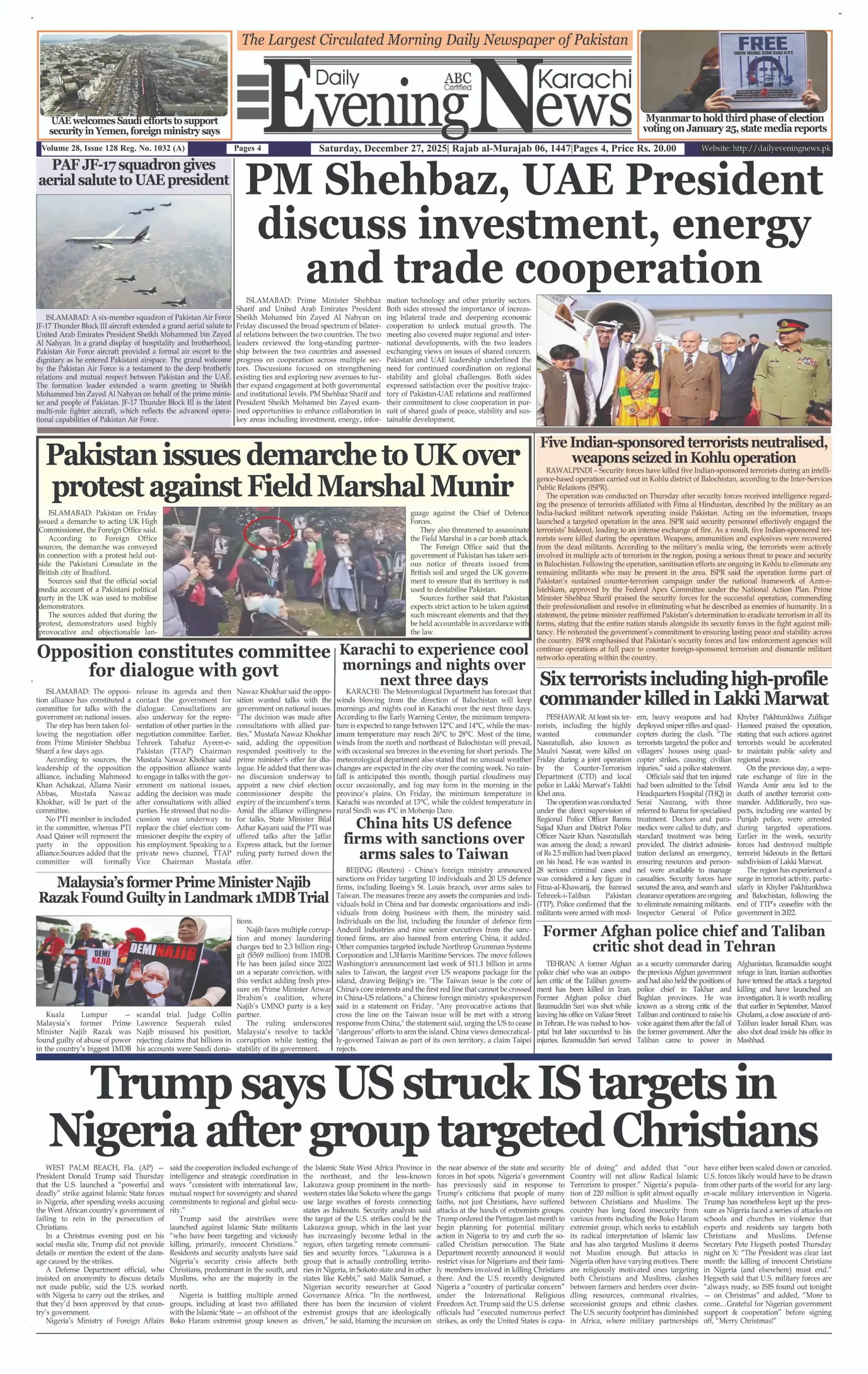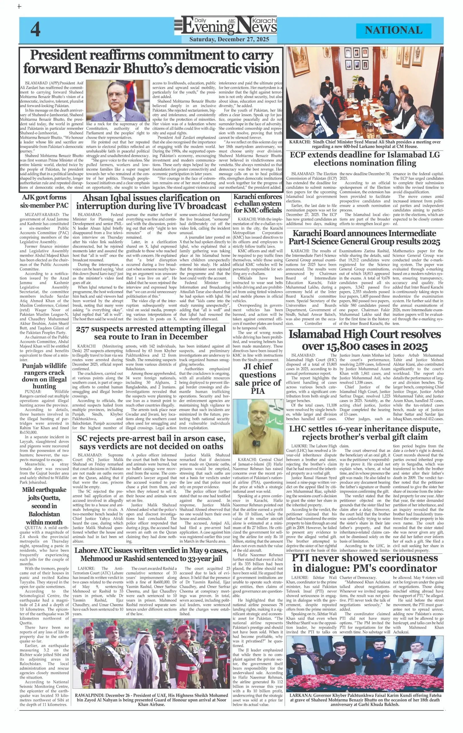 ePaperUncategorized Saturday December 27, 2025 By: admin Date: December 27, 2025 TagsDaily Evening Newsepaper Previous articleMyanmar to hold third phase of election voting on January 25Next articleMohtarma Benazir Bhutto remembered on 18th martyrdom day adminhttps://dailyeveningnews.pk LEAVE A REPLY Cancel reply Comment: Please enter your comment! Name:* Please enter your name here Email:* You have entered an incorrect email address! Please enter your email address here Website: Save my name, email, and website in this browser for the next time I comment. Share post: FacebookTwitterPinterestWhatsApp SubscribeI want inI've read and accept the Privacy Policy. Popular Lebanon Says President Will Not Speak to Israeli PM Netanyahu Pope Leo Warns World Controlled by ‘Cruel Leaders’ Israeli Airstrikes Destroy Last Bridge Linking South Lebanon PSL 11: Hyderabad Kings Beat Rawalpindi by 5 Wickets Pakistan to Reduce Power Load Shedding From Tonight: Federal Minister More like thisRelated Lebanon Says President Will Not Speak to Israeli PM Netanyahu admin - April 16, 2026 Beirut, Lebanon – Web Desk: Lebanese authorities have confirmed... Pope Leo Warns World Controlled by ‘Cruel Leaders’ admin - April 16, 2026 Yaoundé, Cameroon – Web Desk: Catholic Church leader Pope... Israeli Airstrikes Destroy Last Bridge Linking South Lebanon admin - April 16, 2026 Beirut, Lebanon – Web Desk: Israeli airstrikes have destroyed... PSL 11: Hyderabad Kings Beat Rawalpindi by 5 Wickets admin - April 16, 2026 Karachi, Pakistan – Web Desk: In the 11th edition...