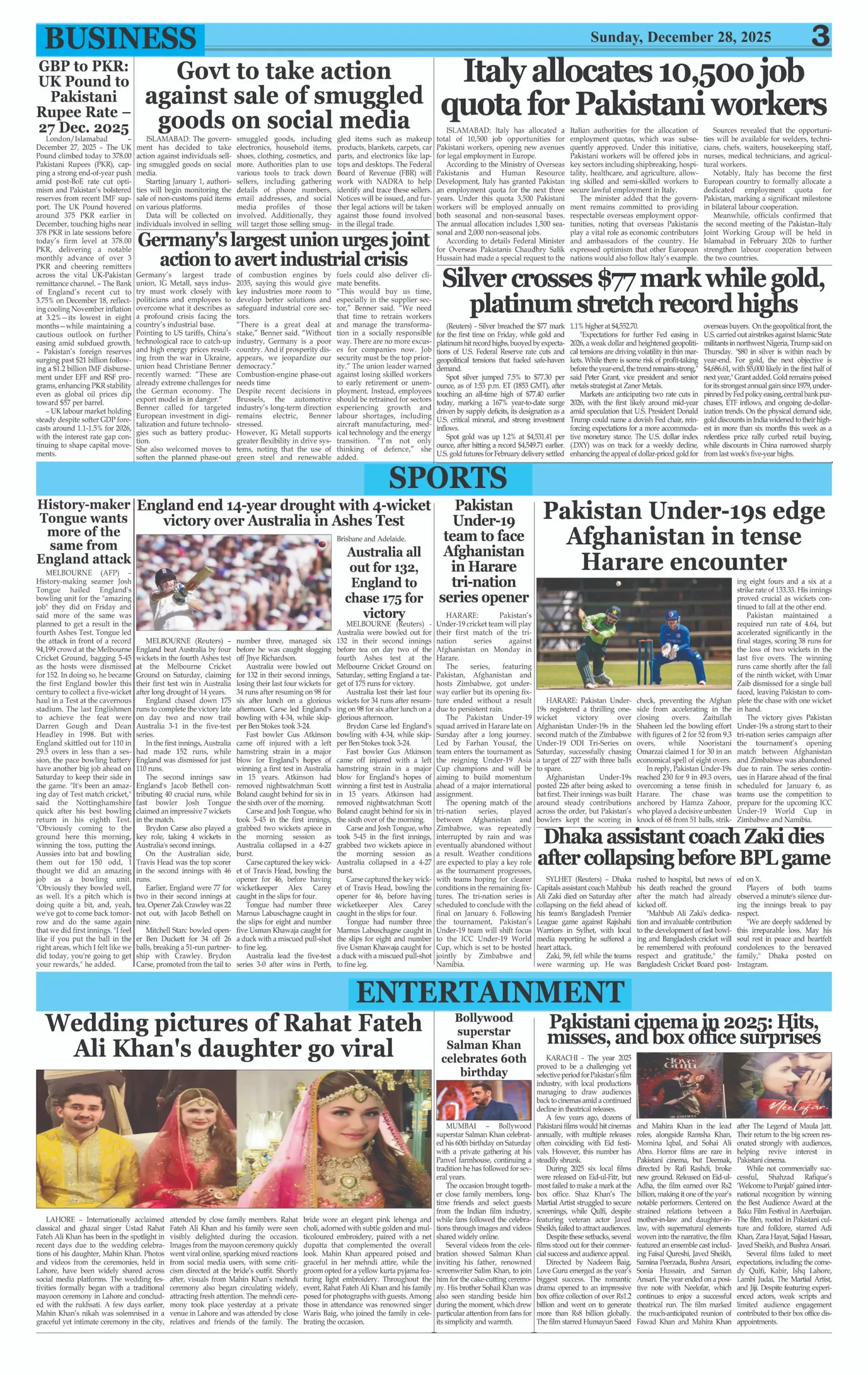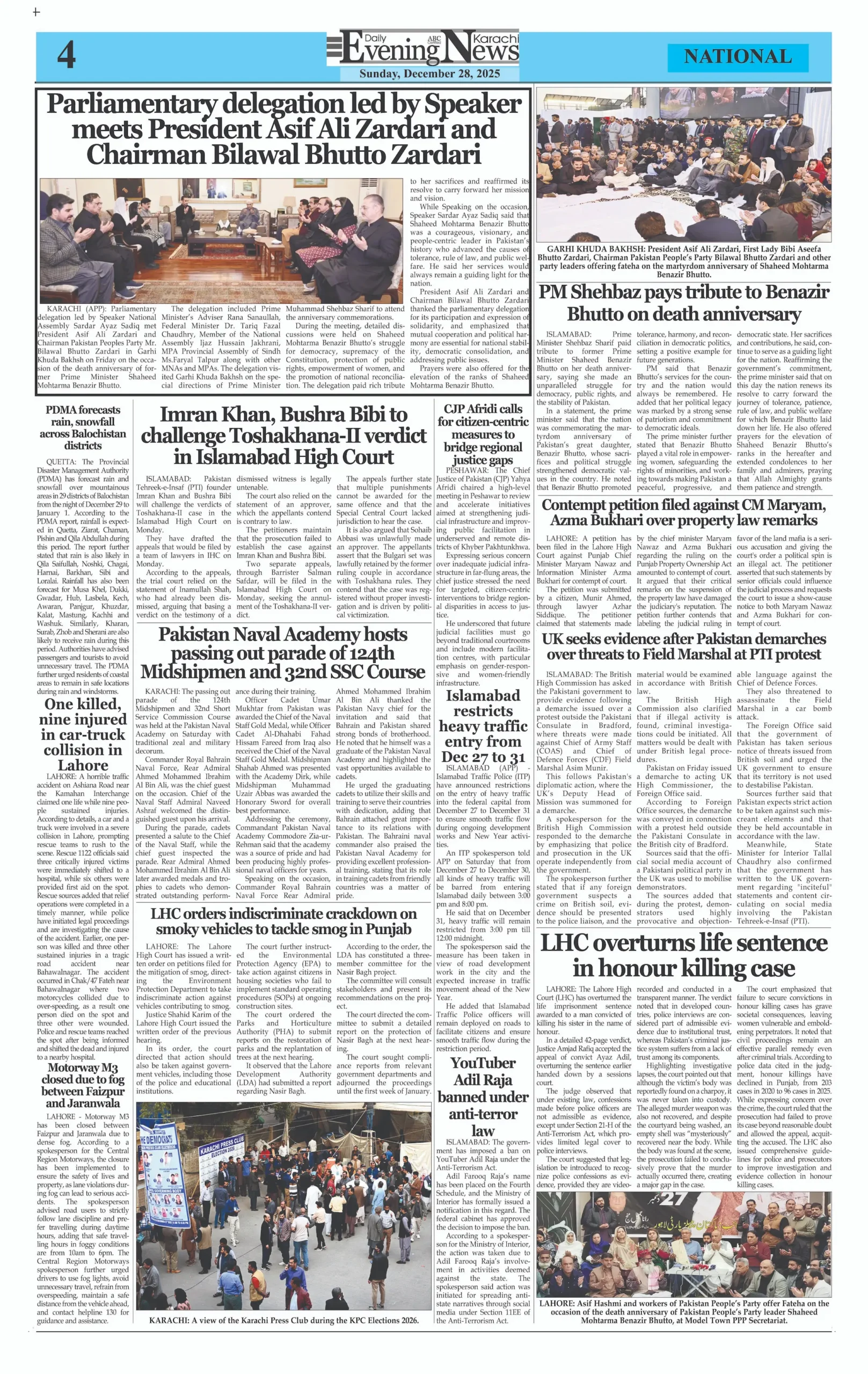 ePaper Sunday December 28, 2025 By: admin Date: December 28, 2025 TagsDaily Evening NewsDaily Newspaperepaper Previous articleKarachi Press Club Elections 2026: The Democrats Panel Sweeps for 18th Consecutive TermNext articleBilawal Urges PTI to Return to Democratic Path, Not Street Confrontation adminhttps://dailyeveningnews.pk LEAVE A REPLY Cancel reply Comment: Please enter your comment! Name:* Please enter your name here Email:* You have entered an incorrect email address! Please enter your email address here Website: Save my name, email, and website in this browser for the next time I comment. Share post: FacebookTwitterPinterestWhatsApp SubscribeI want inI've read and accept the Privacy Policy. Popular Lebanon Says President Will Not Speak to Israeli PM Netanyahu Pope Leo Warns World Controlled by ‘Cruel Leaders’ Israeli Airstrikes Destroy Last Bridge Linking South Lebanon PSL 11: Hyderabad Kings Beat Rawalpindi by 5 Wickets Pakistan to Reduce Power Load Shedding From Tonight: Federal Minister More like thisRelated Lebanon Says President Will Not Speak to Israeli PM Netanyahu admin - April 16, 2026 Beirut, Lebanon – Web Desk: Lebanese authorities have confirmed... Pope Leo Warns World Controlled by ‘Cruel Leaders’ admin - April 16, 2026 Yaoundé, Cameroon – Web Desk: Catholic Church leader Pope... Israeli Airstrikes Destroy Last Bridge Linking South Lebanon admin - April 16, 2026 Beirut, Lebanon – Web Desk: Israeli airstrikes have destroyed... PSL 11: Hyderabad Kings Beat Rawalpindi by 5 Wickets admin - April 16, 2026 Karachi, Pakistan – Web Desk: In the 11th edition...