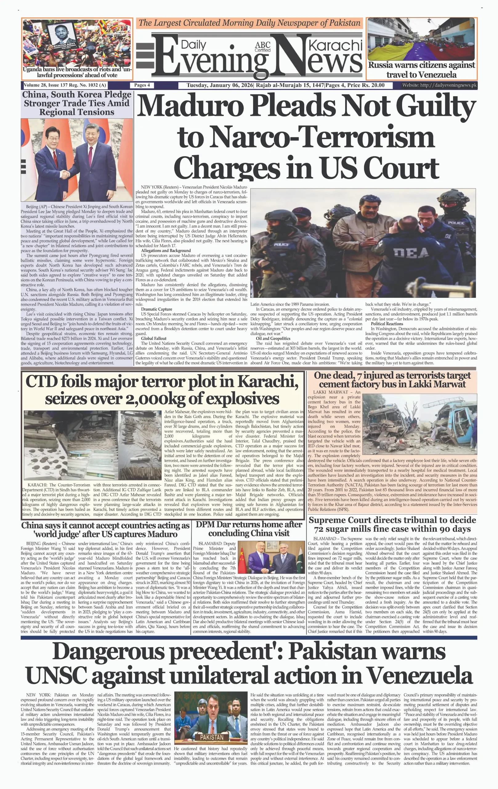 ePaper Tuesday January 06, 2026 By: admin Date: January 6, 2026 TagsDaily Evening Newsepaper Previous articlePakistan Alerts UN: US Action in Venezuela Threatens LawNext articleKP CM to begin three-day Karachi tour to lead party activities adminhttps://dailyeveningnews.pk LEAVE A REPLY Cancel reply Comment: Please enter your comment! Name:* Please enter your name here Email:* You have entered an incorrect email address! Please enter your email address here Website: Save my name, email, and website in this browser for the next time I comment. Share post: FacebookTwitterPinterestWhatsApp SubscribeI want inI've read and accept the Privacy Policy. Popular Lebanon Says President Will Not Speak to Israeli PM Netanyahu Pope Leo Warns World Controlled by ‘Cruel Leaders’ Israeli Airstrikes Destroy Last Bridge Linking South Lebanon PSL 11: Hyderabad Kings Beat Rawalpindi by 5 Wickets Pakistan to Reduce Power Load Shedding From Tonight: Federal Minister More like thisRelated Lebanon Says President Will Not Speak to Israeli PM Netanyahu admin - April 16, 2026 Beirut, Lebanon – Web Desk: Lebanese authorities have confirmed... Pope Leo Warns World Controlled by ‘Cruel Leaders’ admin - April 16, 2026 Yaoundé, Cameroon – Web Desk: Catholic Church leader Pope... Israeli Airstrikes Destroy Last Bridge Linking South Lebanon admin - April 16, 2026 Beirut, Lebanon – Web Desk: Israeli airstrikes have destroyed... PSL 11: Hyderabad Kings Beat Rawalpindi by 5 Wickets admin - April 16, 2026 Karachi, Pakistan – Web Desk: In the 11th edition...