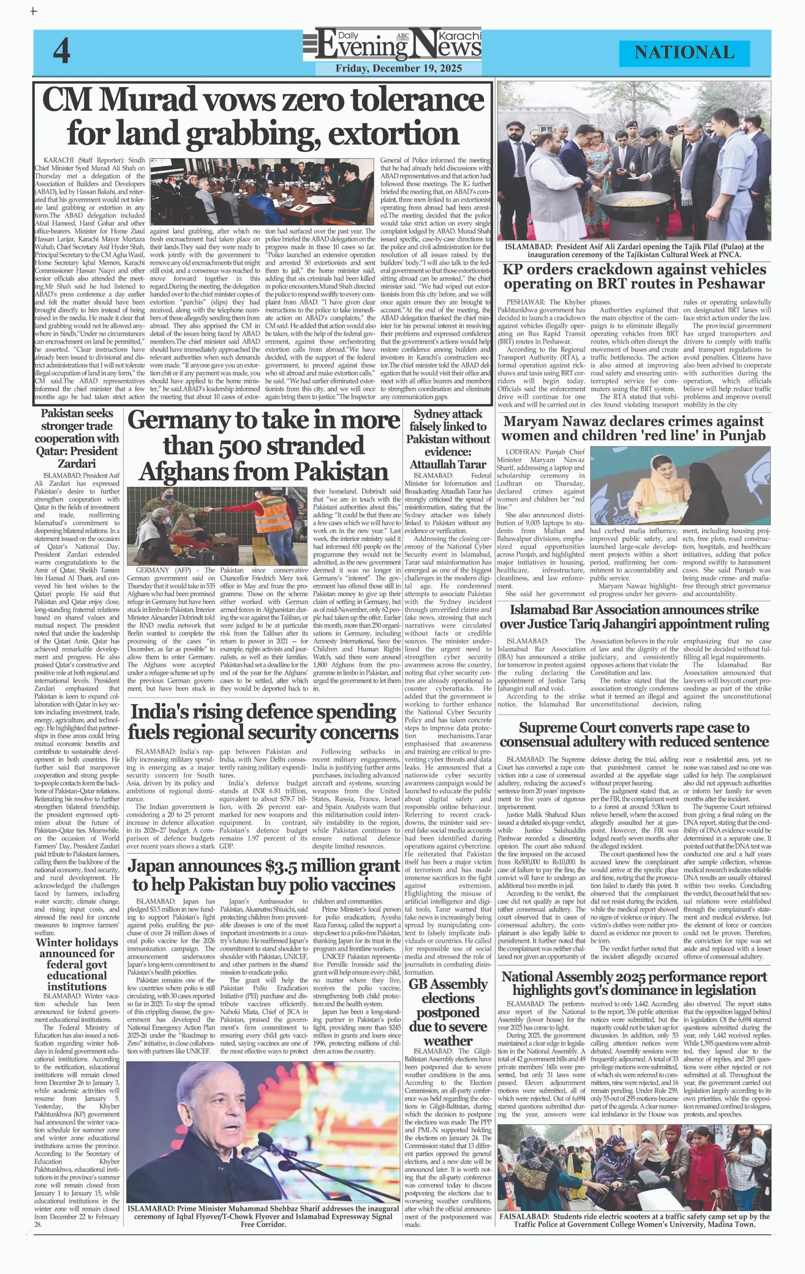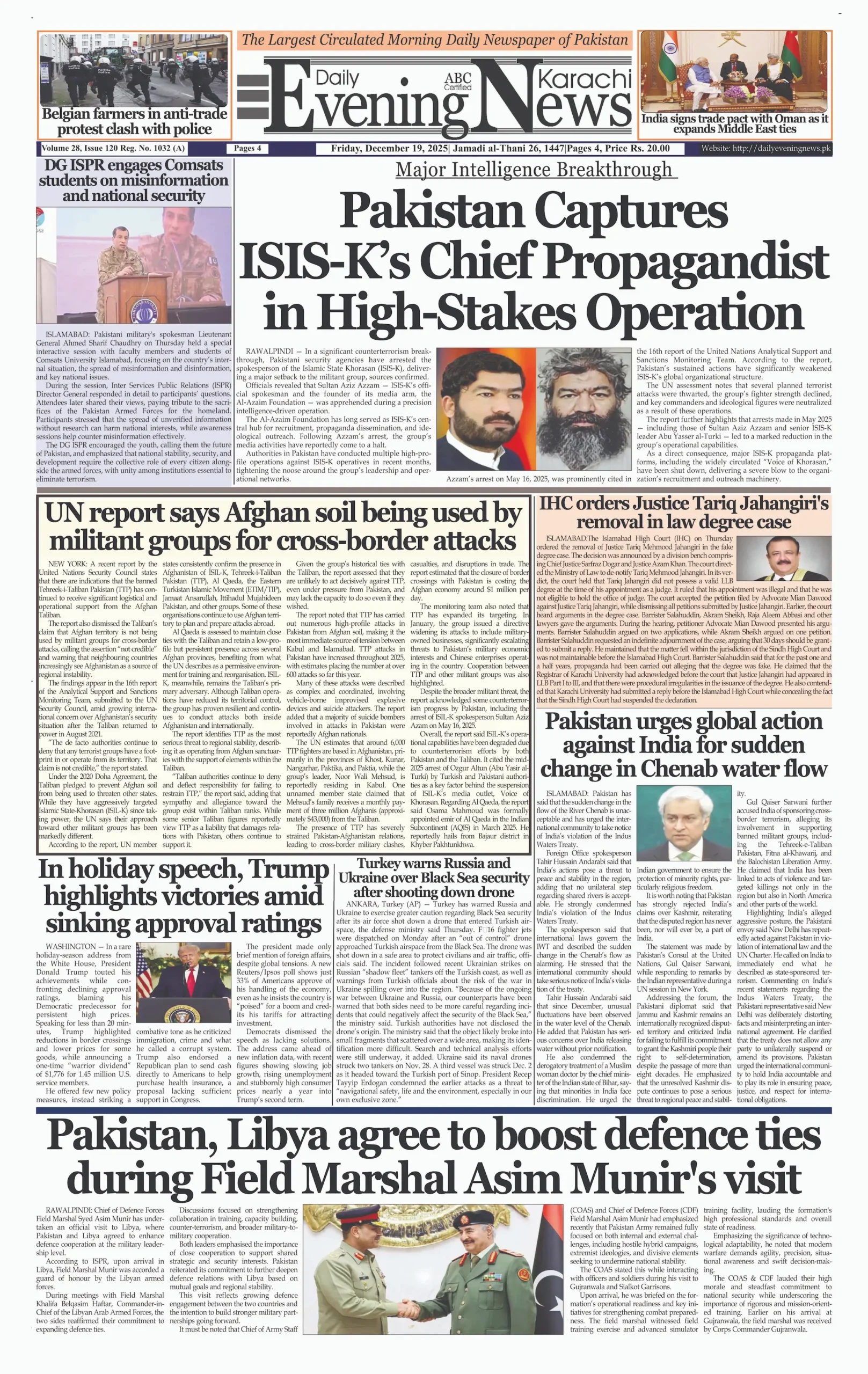 ePaper Friday December 19, 2025 By: admin Date: December 19, 2025 TagsdailyeveningnewsDailynewspaperepaper Previous articleMajor Intelligence Breakthrough: Pakistan Captures ISIS‑K’s Chief Propagandist in High‑Stakes OperationNext articleUN Report Clears Pakistan, Finds India’s Sindoor Strikes Illegal adminhttps://dailyeveningnews.pk LEAVE A REPLY Cancel reply Comment: Please enter your comment! Name:* Please enter your name here Email:* You have entered an incorrect email address! Please enter your email address here Website: Save my name, email, and website in this browser for the next time I comment. Share post: FacebookTwitterPinterestWhatsApp SubscribeI want inI've read and accept the Privacy Policy. Popular Lebanon Says President Will Not Speak to Israeli PM Netanyahu Pope Leo Warns World Controlled by ‘Cruel Leaders’ Israeli Airstrikes Destroy Last Bridge Linking South Lebanon PSL 11: Hyderabad Kings Beat Rawalpindi by 5 Wickets Pakistan to Reduce Power Load Shedding From Tonight: Federal Minister More like thisRelated Lebanon Says President Will Not Speak to Israeli PM Netanyahu admin - April 16, 2026 Beirut, Lebanon – Web Desk: Lebanese authorities have confirmed... Pope Leo Warns World Controlled by ‘Cruel Leaders’ admin - April 16, 2026 Yaoundé, Cameroon – Web Desk: Catholic Church leader Pope... Israeli Airstrikes Destroy Last Bridge Linking South Lebanon admin - April 16, 2026 Beirut, Lebanon – Web Desk: Israeli airstrikes have destroyed... PSL 11: Hyderabad Kings Beat Rawalpindi by 5 Wickets admin - April 16, 2026 Karachi, Pakistan – Web Desk: In the 11th edition...