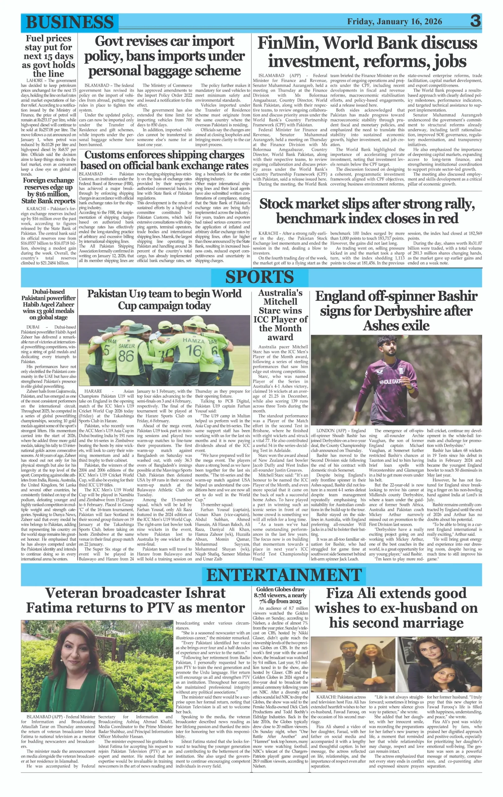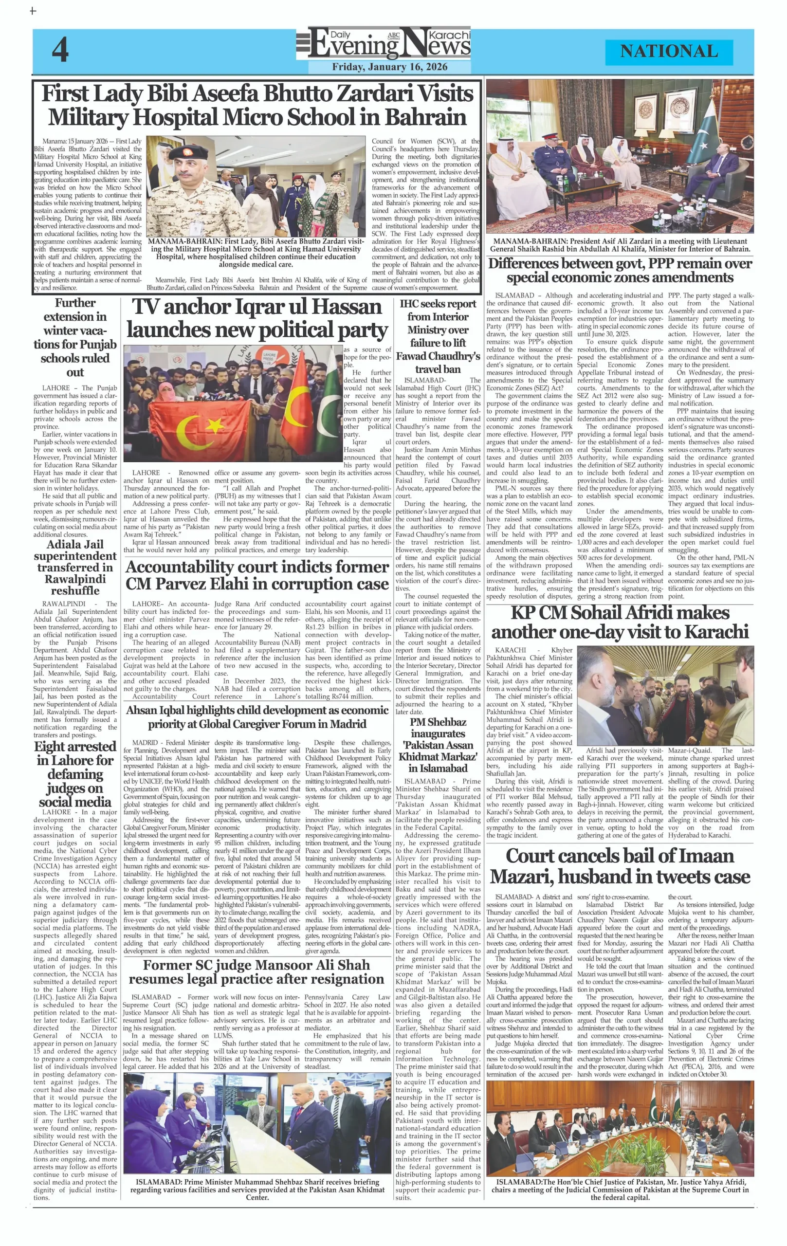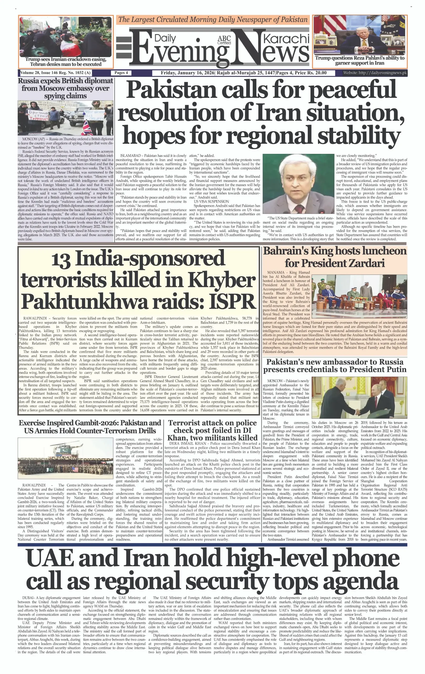 ePaper Friday January 16,2026 By: admin Date: January 16, 2026 TagsDaily Evening NewsNewspaper Previous articleBahrain’s King hosts luncheon for President ZardariNext articleMarkets roar back as PSX gains over 3,000 points adminhttps://dailyeveningnews.pk LEAVE A REPLY Cancel reply Comment: Please enter your comment! Name:* Please enter your name here Email:* You have entered an incorrect email address! Please enter your email address here Website: Save my name, email, and website in this browser for the next time I comment. Share post: FacebookTwitterPinterestWhatsApp SubscribeI want inI've read and accept the Privacy Policy. Popular Ramsha Khan & Khushhal Khan Confirm Wedding on Social Media President Trump Praises Pakistan’s Prime Minister and Field Marshal as Outstanding Leaders Pakistan Expects Fuel Price Cut After Hormuz Reopens Saudi Arabia Rolls Over $3bn Deposit in Pakistan Deal Pakistan Records Rs 1,234bn Petroleum Levy Collection More like thisRelated Ramsha Khan & Khushhal Khan Confirm Wedding on Social Media admin - April 17, 2026 Karachi, Pakistan - Web Desk: Speculation surrounding the relationship... President Trump Praises Pakistan’s Prime Minister and Field Marshal as Outstanding Leaders admin - April 17, 2026 Washington, United States - Web Desk: US President Donald... Pakistan Expects Fuel Price Cut After Hormuz Reopens admin - April 17, 2026 Islamabad, Pakistan - Web Desk: Federal Minister for Energy... Saudi Arabia Rolls Over $3bn Deposit in Pakistan Deal admin - April 17, 2026 Islamabad, Pakistan - Web Desk: Saudi Arabia has rolled...