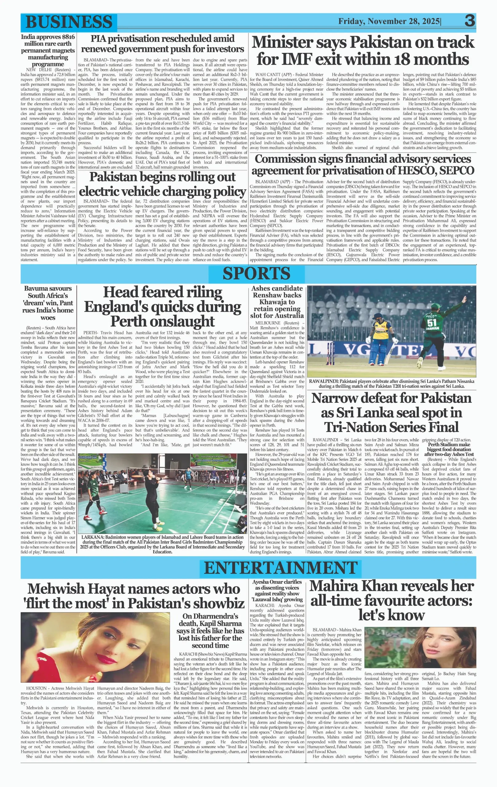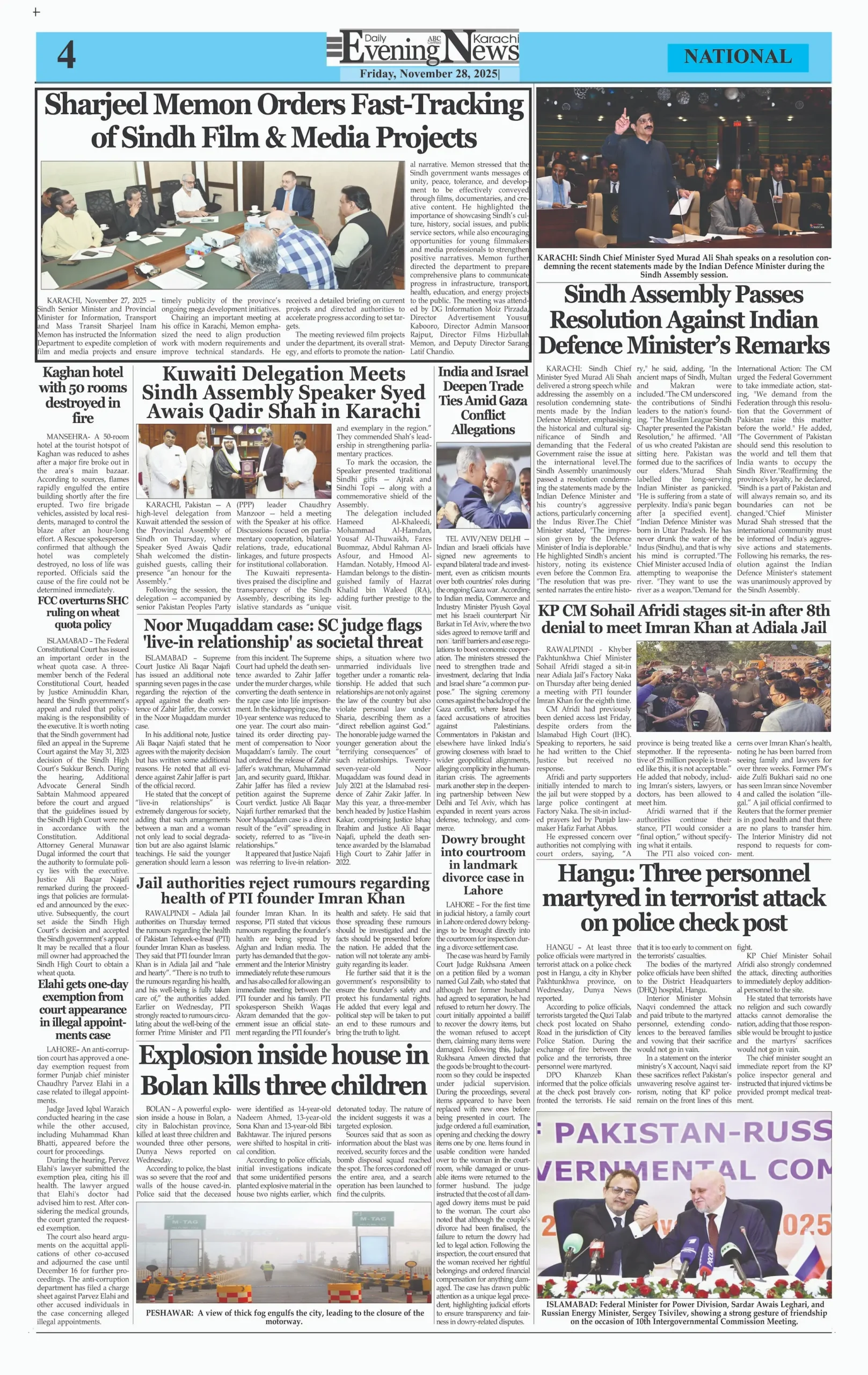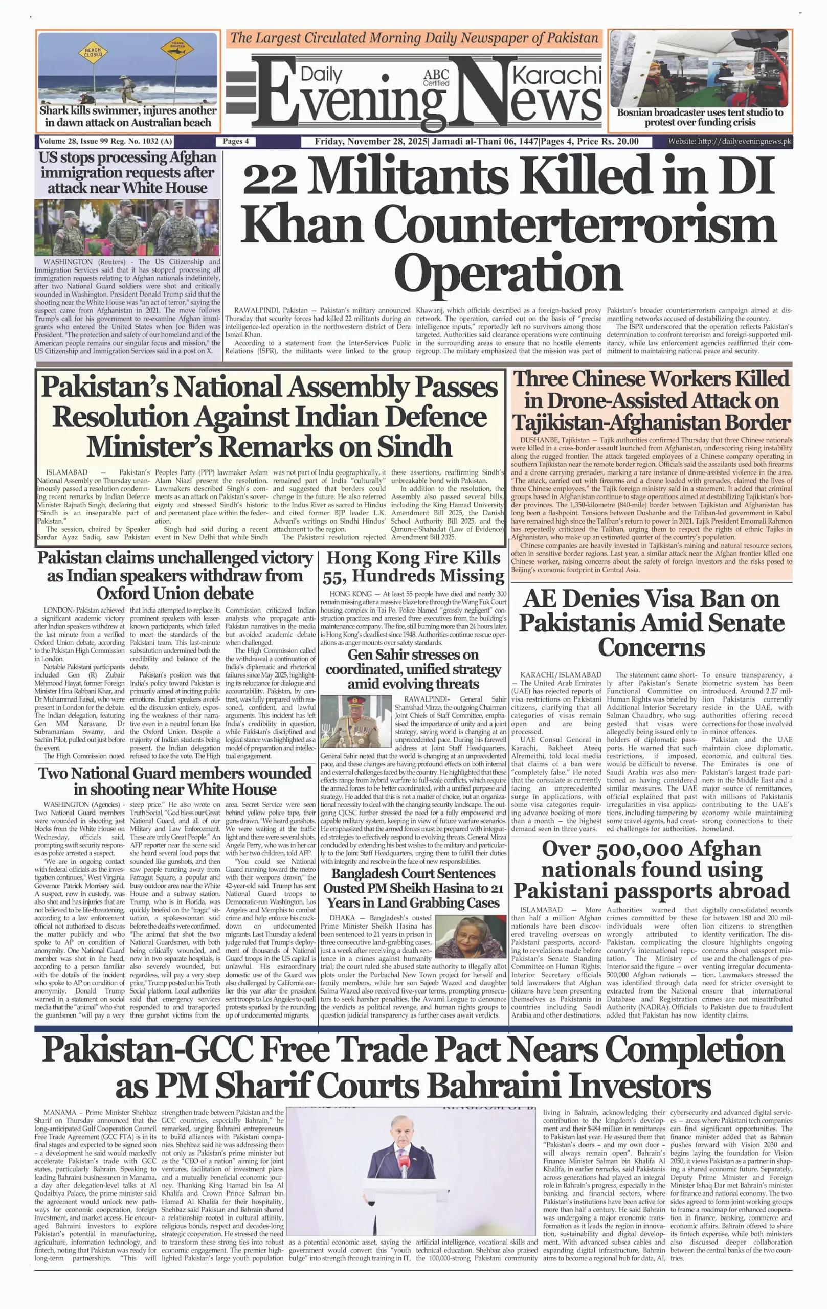 ePaper Friday November 28, 2025 By: admin Date: November 28, 2025 TagsDailyDaily Evening NewsDaily Newspaperepaper Previous article22 Indian-Sponsored Terrorists Eliminated in DI Khan OperationNext articleTrump says to ‘permanently pause migration from all Third World countries’ adminhttps://dailyeveningnews.pk LEAVE A REPLY Cancel reply Comment: Please enter your comment! Name:* Please enter your name here Email:* You have entered an incorrect email address! Please enter your email address here Website: Save my name, email, and website in this browser for the next time I comment. Share post: FacebookTwitterPinterestWhatsApp SubscribeI want inI've read and accept the Privacy Policy. Popular Lebanon Says President Will Not Speak to Israeli PM Netanyahu Pope Leo Warns World Controlled by ‘Cruel Leaders’ Israeli Airstrikes Destroy Last Bridge Linking South Lebanon PSL 11: Hyderabad Kings Beat Rawalpindi by 5 Wickets Pakistan to Reduce Power Load Shedding From Tonight: Federal Minister More like thisRelated Lebanon Says President Will Not Speak to Israeli PM Netanyahu admin - April 16, 2026 Beirut, Lebanon – Web Desk: Lebanese authorities have confirmed... Pope Leo Warns World Controlled by ‘Cruel Leaders’ admin - April 16, 2026 Yaoundé, Cameroon – Web Desk: Catholic Church leader Pope... Israeli Airstrikes Destroy Last Bridge Linking South Lebanon admin - April 16, 2026 Beirut, Lebanon – Web Desk: Israeli airstrikes have destroyed... PSL 11: Hyderabad Kings Beat Rawalpindi by 5 Wickets admin - April 16, 2026 Karachi, Pakistan – Web Desk: In the 11th edition...