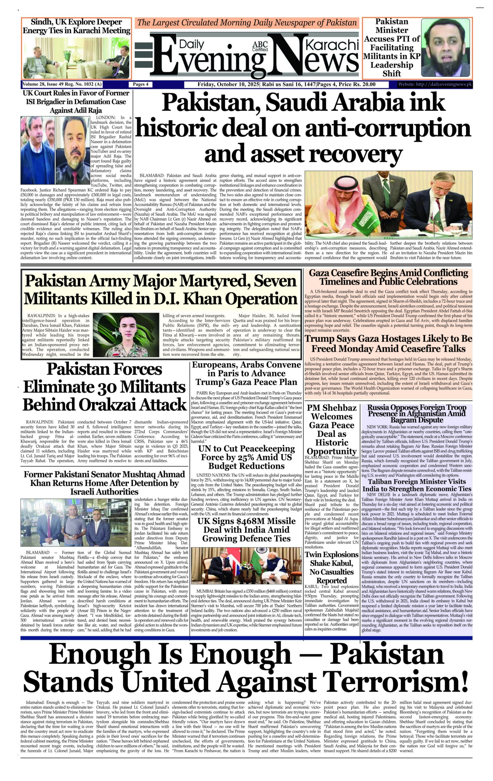 ePaper Friday October 10, 2025 By: admin Date: October 10, 2025 DOWNLOAD ePaper Tagsepaper Previous articleNew Era of Transparency: Pakistan and Saudi Arabia Ink Anti-Corruption DealNext articleA New Dawn for Gaza: Ceasefire Begins, Israeli Troops Pull Back adminhttps://dailyeveningnews.pk LEAVE A REPLY Cancel reply Comment: Please enter your comment! Name:* Please enter your name here Email:* You have entered an incorrect email address! Please enter your email address here Website: Save my name, email, and website in this browser for the next time I comment. Share post: FacebookTwitterPinterestWhatsApp SubscribeI want inI've read and accept the Privacy Policy. Popular Lebanon Says President Will Not Speak to Israeli PM Netanyahu Pope Leo Warns World Controlled by ‘Cruel Leaders’ Israeli Airstrikes Destroy Last Bridge Linking South Lebanon PSL 11: Hyderabad Kings Beat Rawalpindi by 5 Wickets Pakistan to Reduce Power Load Shedding From Tonight: Federal Minister More like thisRelated Lebanon Says President Will Not Speak to Israeli PM Netanyahu admin - April 16, 2026 Beirut, Lebanon – Web Desk: Lebanese authorities have confirmed... Pope Leo Warns World Controlled by ‘Cruel Leaders’ admin - April 16, 2026 Yaoundé, Cameroon – Web Desk: Catholic Church leader Pope... Israeli Airstrikes Destroy Last Bridge Linking South Lebanon admin - April 16, 2026 Beirut, Lebanon – Web Desk: Israeli airstrikes have destroyed... PSL 11: Hyderabad Kings Beat Rawalpindi by 5 Wickets admin - April 16, 2026 Karachi, Pakistan – Web Desk: In the 11th edition...
