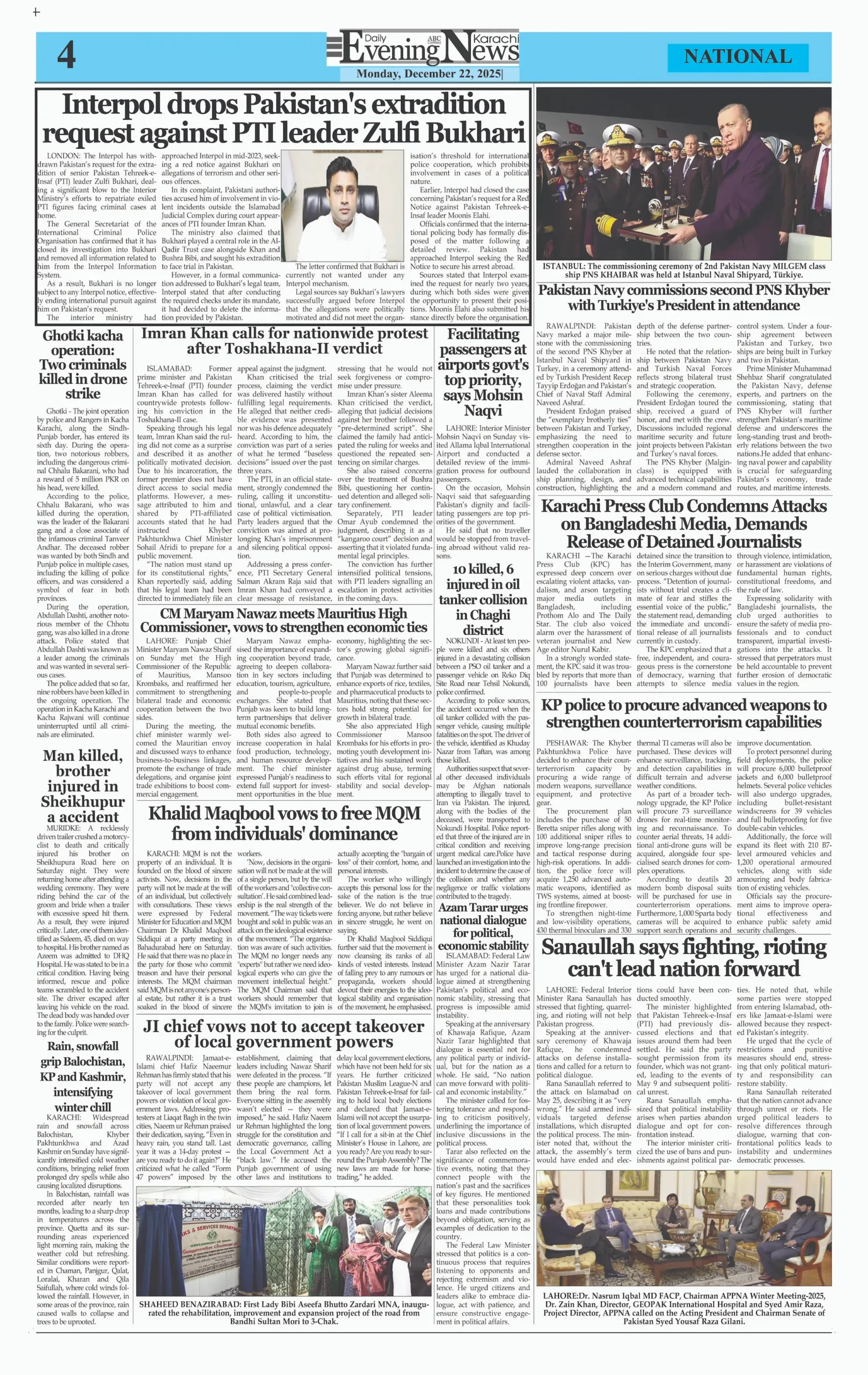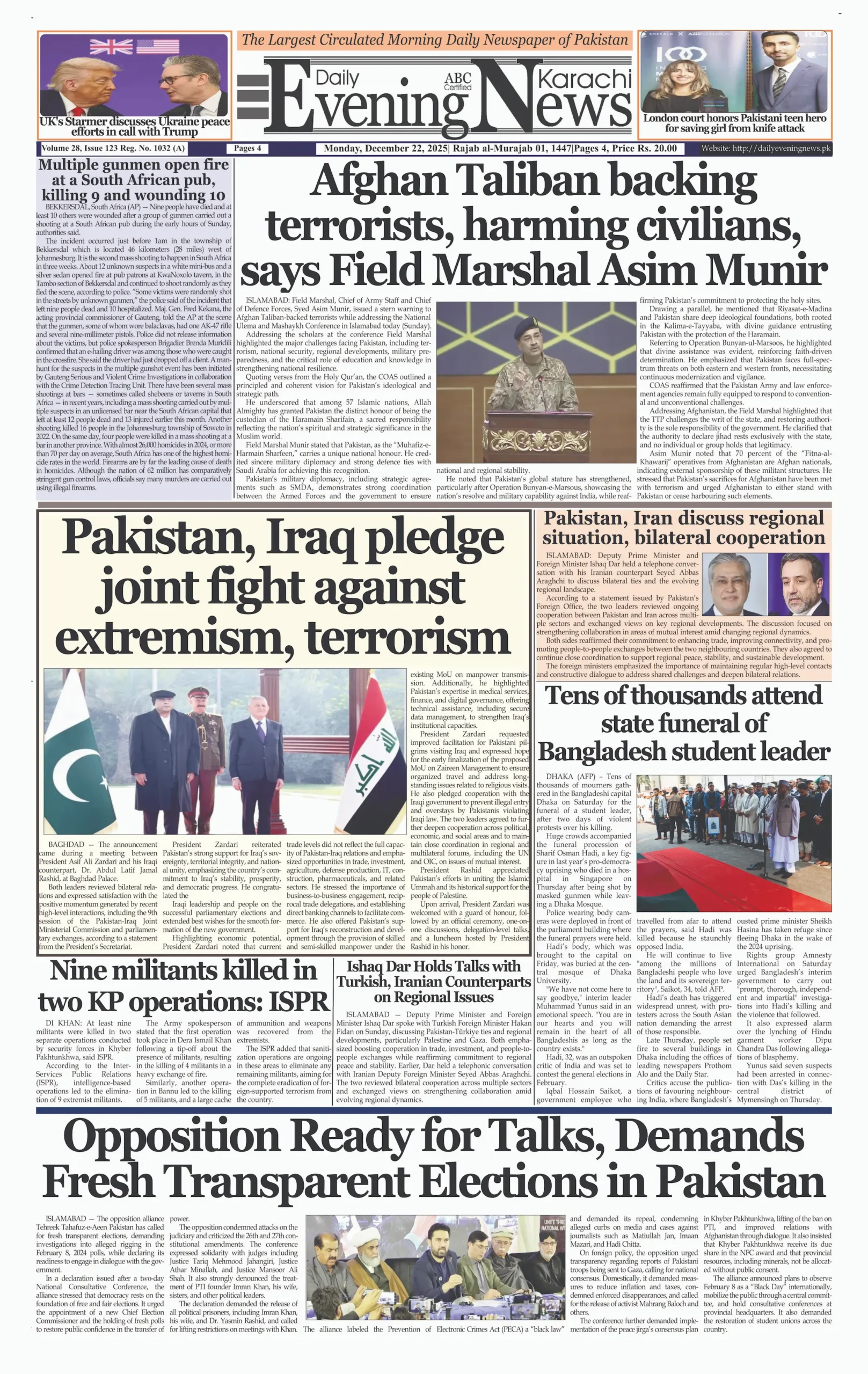 ePaper Monday December 22, 2025 By: admin Date: December 22, 2025 Tagsepaper Previous articlePakistan thrash India by 191 runs to clinch Under-19 CNext articleSaudi Arabia honours Field Marshal Asim Munir with King Abdulaziz Medal adminhttps://dailyeveningnews.pk LEAVE A REPLY Cancel reply Comment: Please enter your comment! Name:* Please enter your name here Email:* You have entered an incorrect email address! Please enter your email address here Website: Save my name, email, and website in this browser for the next time I comment. Share post: FacebookTwitterPinterestWhatsApp SubscribeI want inI've read and accept the Privacy Policy. Popular Lebanon Says President Will Not Speak to Israeli PM Netanyahu Pope Leo Warns World Controlled by ‘Cruel Leaders’ Israeli Airstrikes Destroy Last Bridge Linking South Lebanon PSL 11: Hyderabad Kings Beat Rawalpindi by 5 Wickets Pakistan to Reduce Power Load Shedding From Tonight: Federal Minister More like thisRelated Lebanon Says President Will Not Speak to Israeli PM Netanyahu admin - April 16, 2026 Beirut, Lebanon – Web Desk: Lebanese authorities have confirmed... Pope Leo Warns World Controlled by ‘Cruel Leaders’ admin - April 16, 2026 Yaoundé, Cameroon – Web Desk: Catholic Church leader Pope... Israeli Airstrikes Destroy Last Bridge Linking South Lebanon admin - April 16, 2026 Beirut, Lebanon – Web Desk: Israeli airstrikes have destroyed... PSL 11: Hyderabad Kings Beat Rawalpindi by 5 Wickets admin - April 16, 2026 Karachi, Pakistan – Web Desk: In the 11th edition...