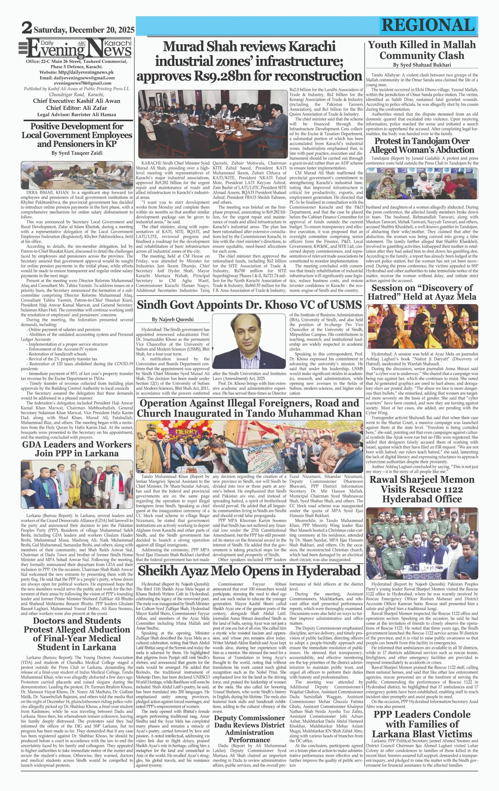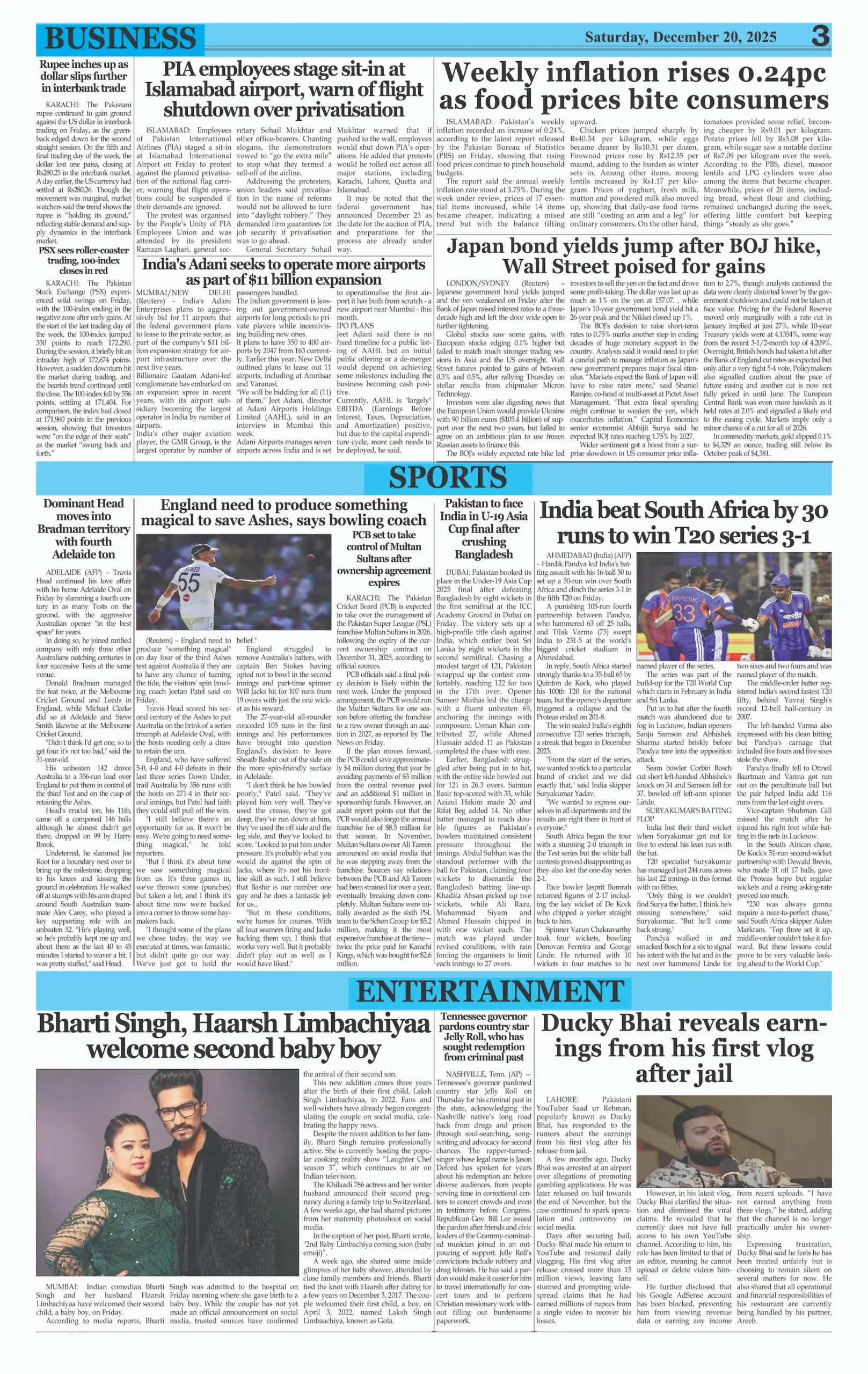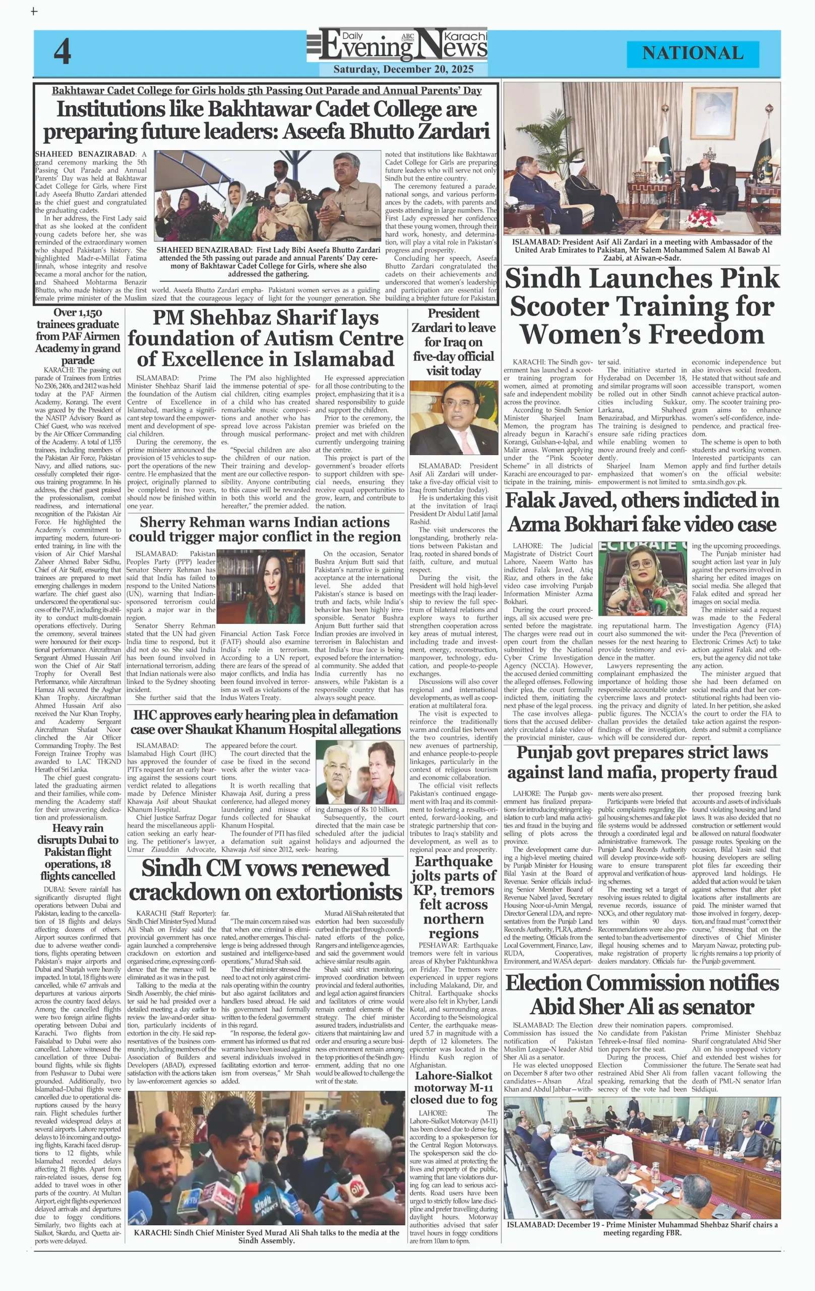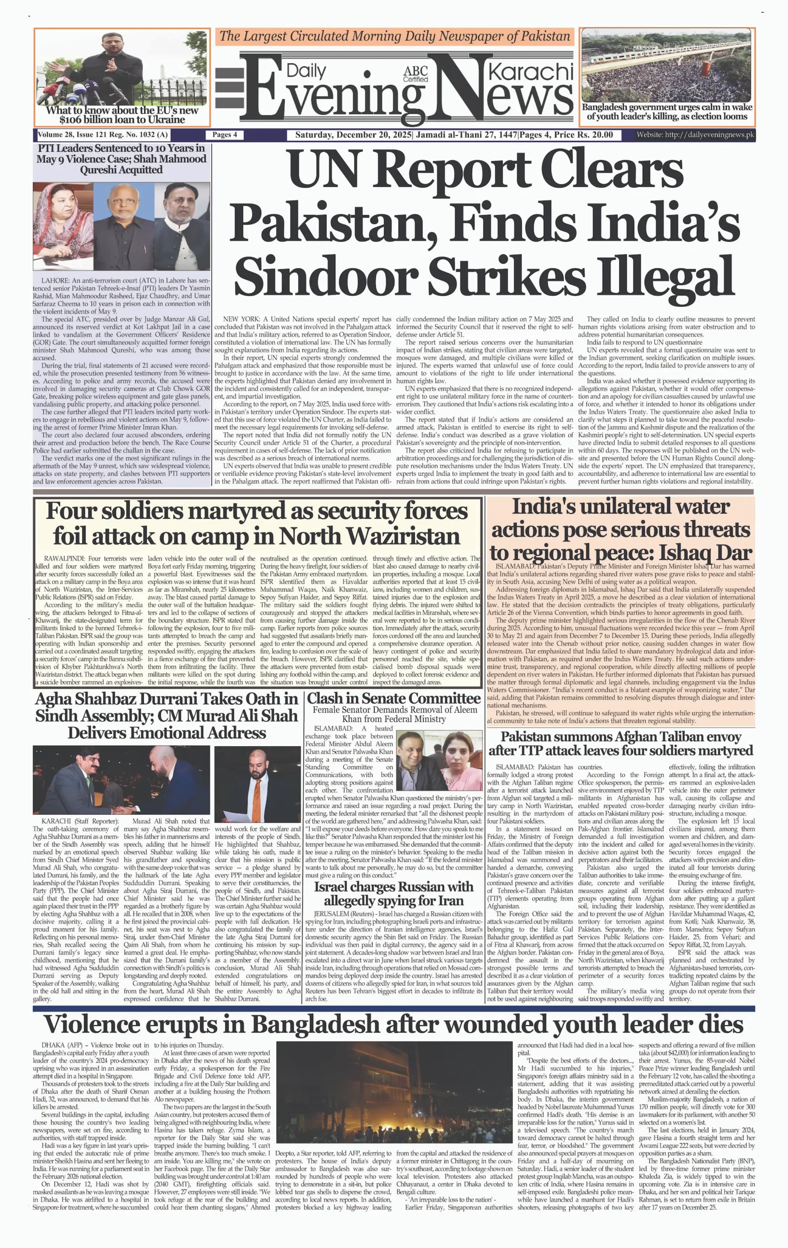 ePaper Saturday December 20, 2025 By: admin Date: December 20, 2025 TagsDaily Newspaperdailyeveningnewsepaper Previous articleFour soldiers martyred as security forces foil attack on camp in North WaziristanNext articleFormer PM Imran Khan, Wife Bushra Bibi Receive 17-Year Jail Terms in Toshakhana Scandal adminhttps://dailyeveningnews.pk LEAVE A REPLY Cancel reply Comment: Please enter your comment! Name:* Please enter your name here Email:* You have entered an incorrect email address! Please enter your email address here Website: Save my name, email, and website in this browser for the next time I comment. Share post: FacebookTwitterPinterestWhatsApp SubscribeI want inI've read and accept the Privacy Policy. Popular Lebanon Says President Will Not Speak to Israeli PM Netanyahu Pope Leo Warns World Controlled by ‘Cruel Leaders’ Israeli Airstrikes Destroy Last Bridge Linking South Lebanon PSL 11: Hyderabad Kings Beat Rawalpindi by 5 Wickets Pakistan to Reduce Power Load Shedding From Tonight: Federal Minister More like thisRelated Lebanon Says President Will Not Speak to Israeli PM Netanyahu admin - April 16, 2026 Beirut, Lebanon – Web Desk: Lebanese authorities have confirmed... Pope Leo Warns World Controlled by ‘Cruel Leaders’ admin - April 16, 2026 Yaoundé, Cameroon – Web Desk: Catholic Church leader Pope... Israeli Airstrikes Destroy Last Bridge Linking South Lebanon admin - April 16, 2026 Beirut, Lebanon – Web Desk: Israeli airstrikes have destroyed... PSL 11: Hyderabad Kings Beat Rawalpindi by 5 Wickets admin - April 16, 2026 Karachi, Pakistan – Web Desk: In the 11th edition...