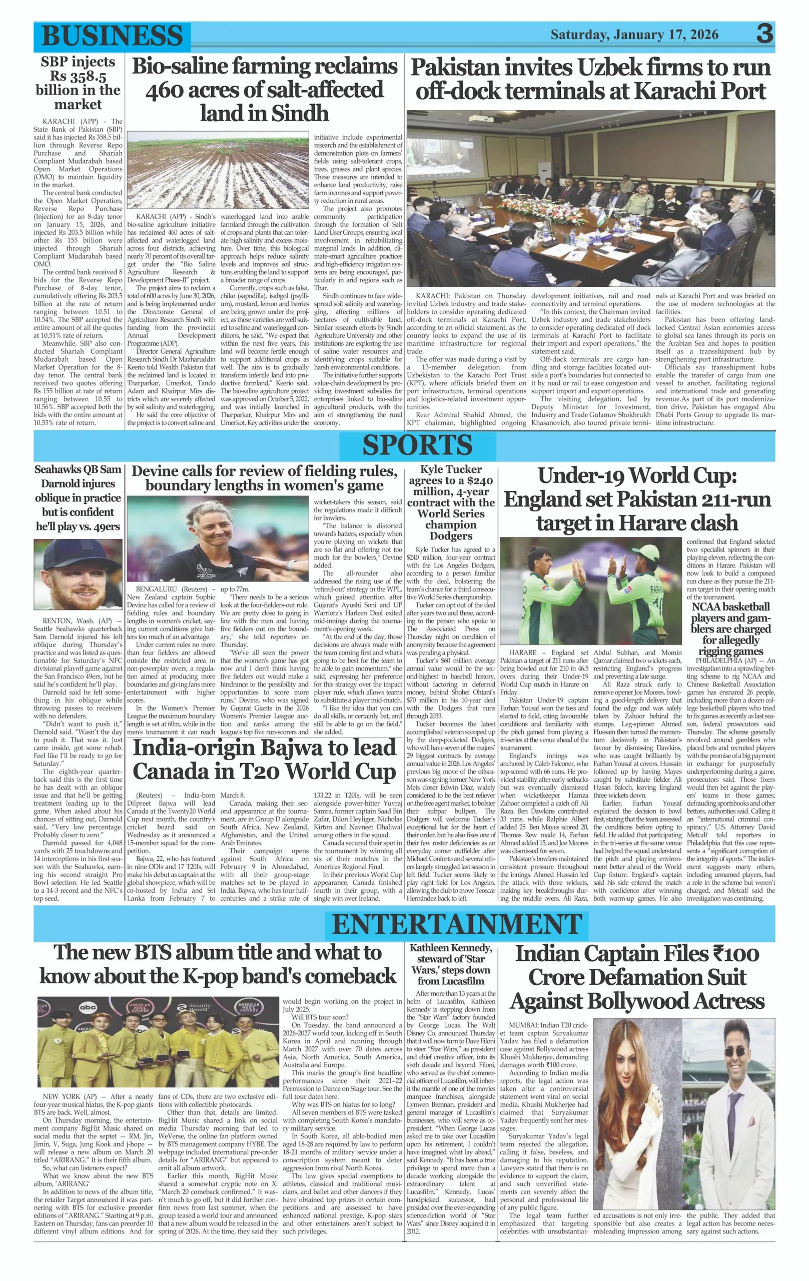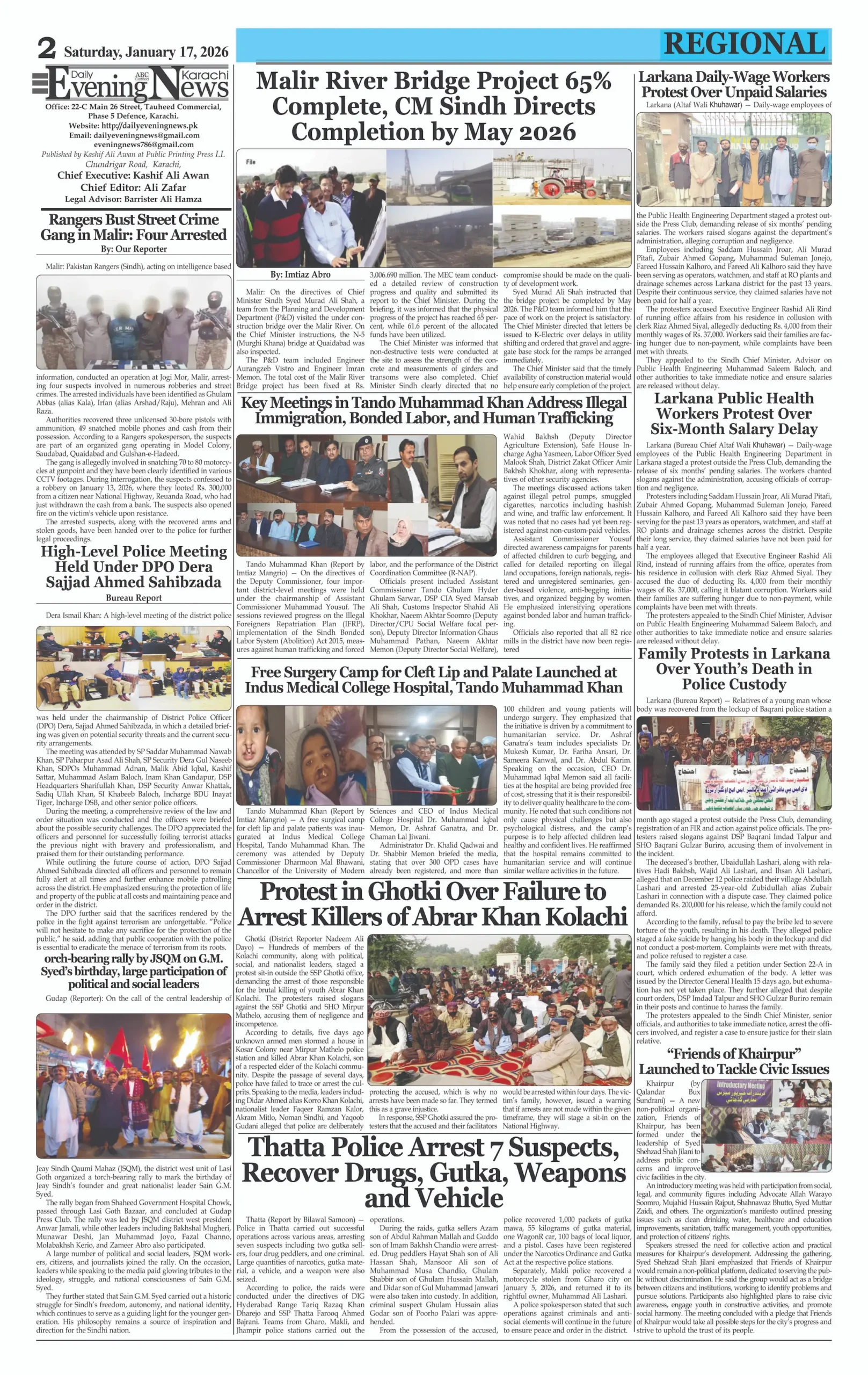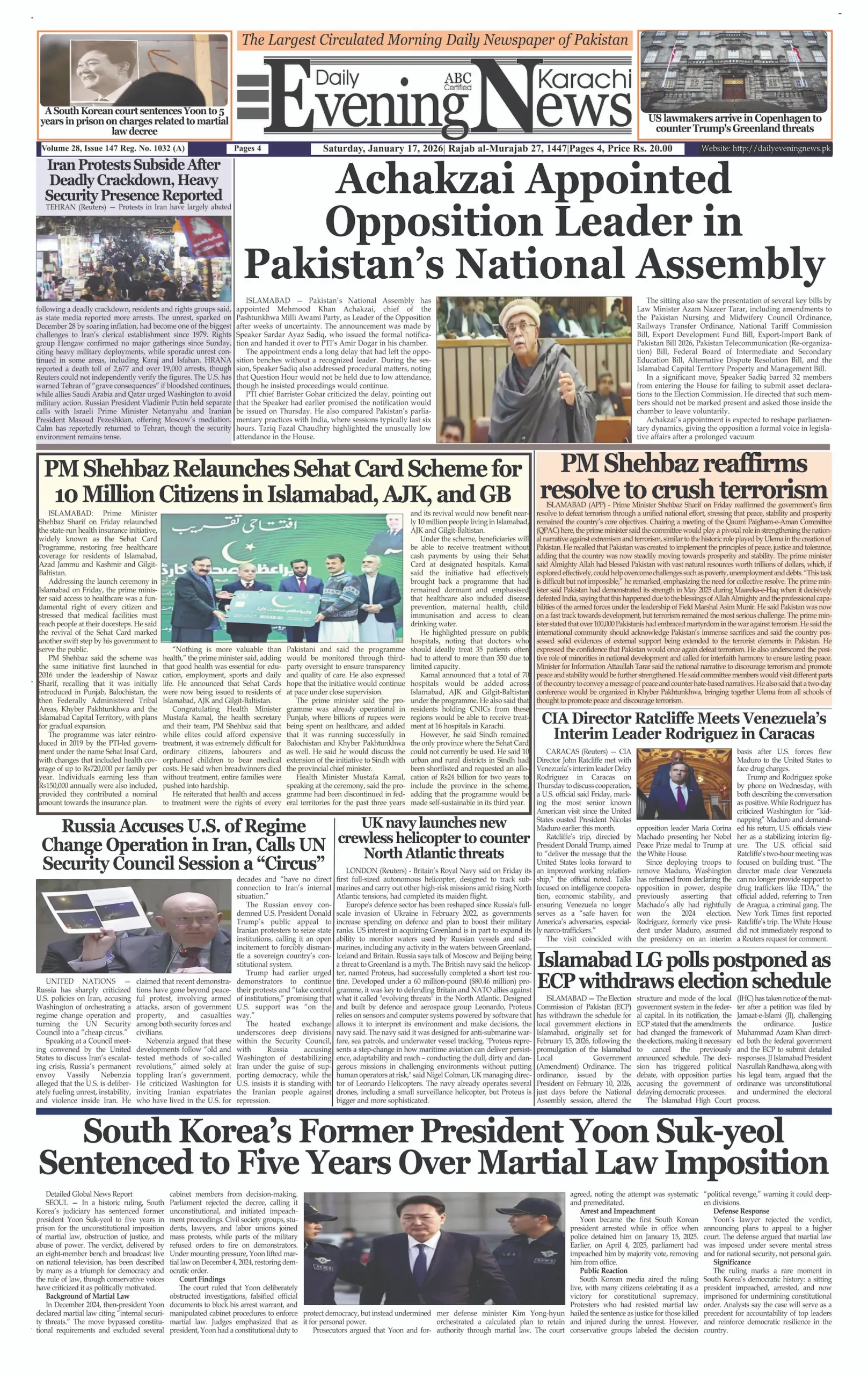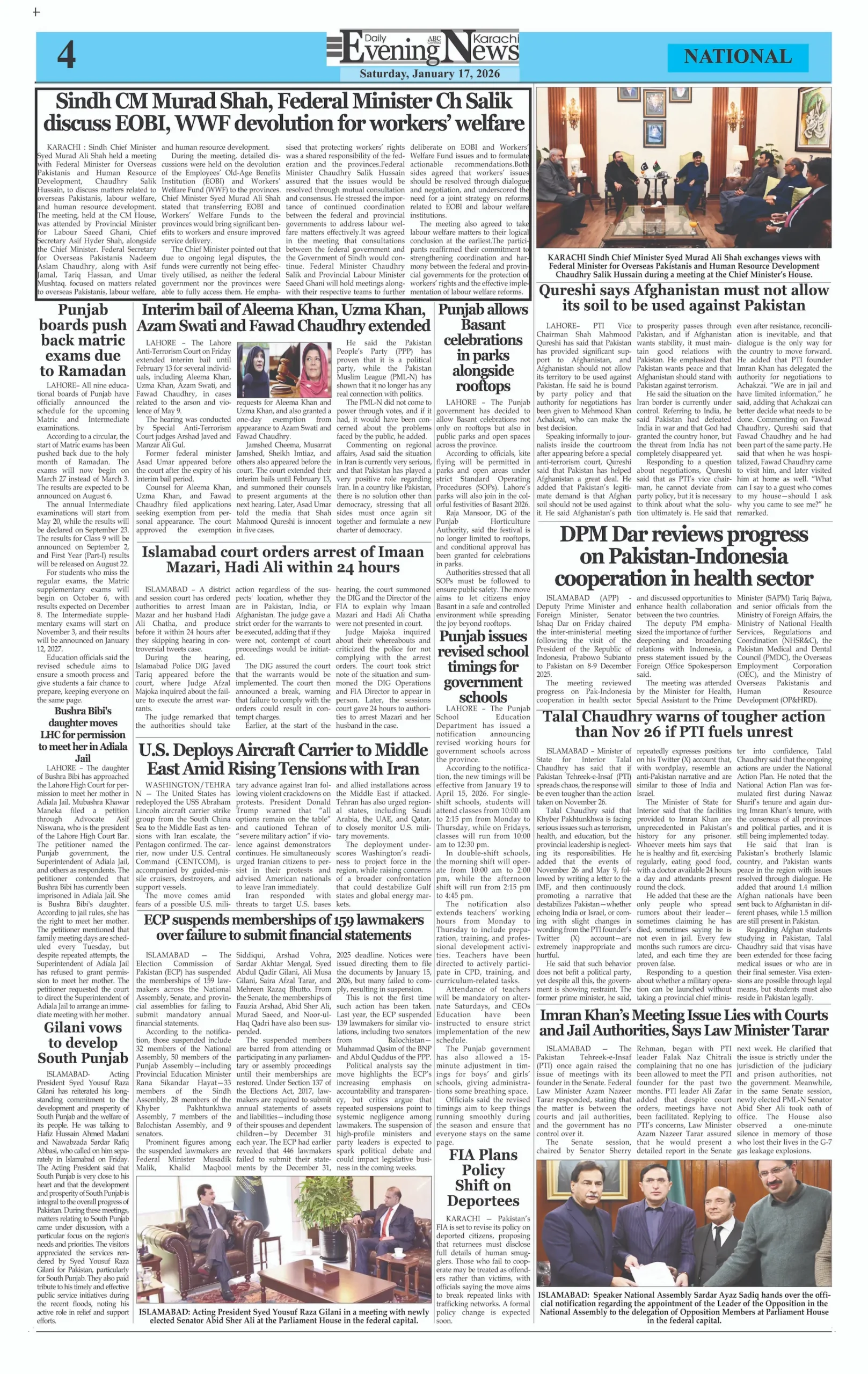 ePaper Saturday January 17, 2026 By: admin Date: January 17, 2026 TagsDailyDaily Evening NewsepaperNewspaper Previous articleSouth Korea Ex-President Sentenced 5 Years for Martial LawNext articleIndian Muslim Lynched for Refusing ‘Jai Shri Ram’ Chant adminhttps://dailyeveningnews.pk LEAVE A REPLY Cancel reply Comment: Please enter your comment! Name:* Please enter your name here Email:* You have entered an incorrect email address! Please enter your email address here Website: Save my name, email, and website in this browser for the next time I comment. Share post: FacebookTwitterPinterestWhatsApp SubscribeI want inI've read and accept the Privacy Policy. Popular PM Shehbaz Meets Qatar Emir After Saudi Arabia Visit Iran Boosts Drone Production Tenfold After War, Says Military SNGPL, SSGC Seek Major Gas Price Hike in Pakistan Trump’s Posts Show Imbalance, Says US Professor Pakistan Calls for Lebanon Ceasefire, Supports Peace Talks More like thisRelated PM Shehbaz Meets Qatar Emir After Saudi Arabia Visit admin - April 16, 2026 Doha, Qatar – Web Desk: Prime Minister Shehbaz Sharif... Iran Boosts Drone Production Tenfold After War, Says Military admin - April 16, 2026 Tehran, Iran – Web Desk: Iran’s armed forces say... SNGPL, SSGC Seek Major Gas Price Hike in Pakistan admin - April 16, 2026 Web Desk – Islamabad, Pakistan’s two major gas... Trump’s Posts Show Imbalance, Says US Professor admin - April 16, 2026 Web Desk – New York, United States A prominent...