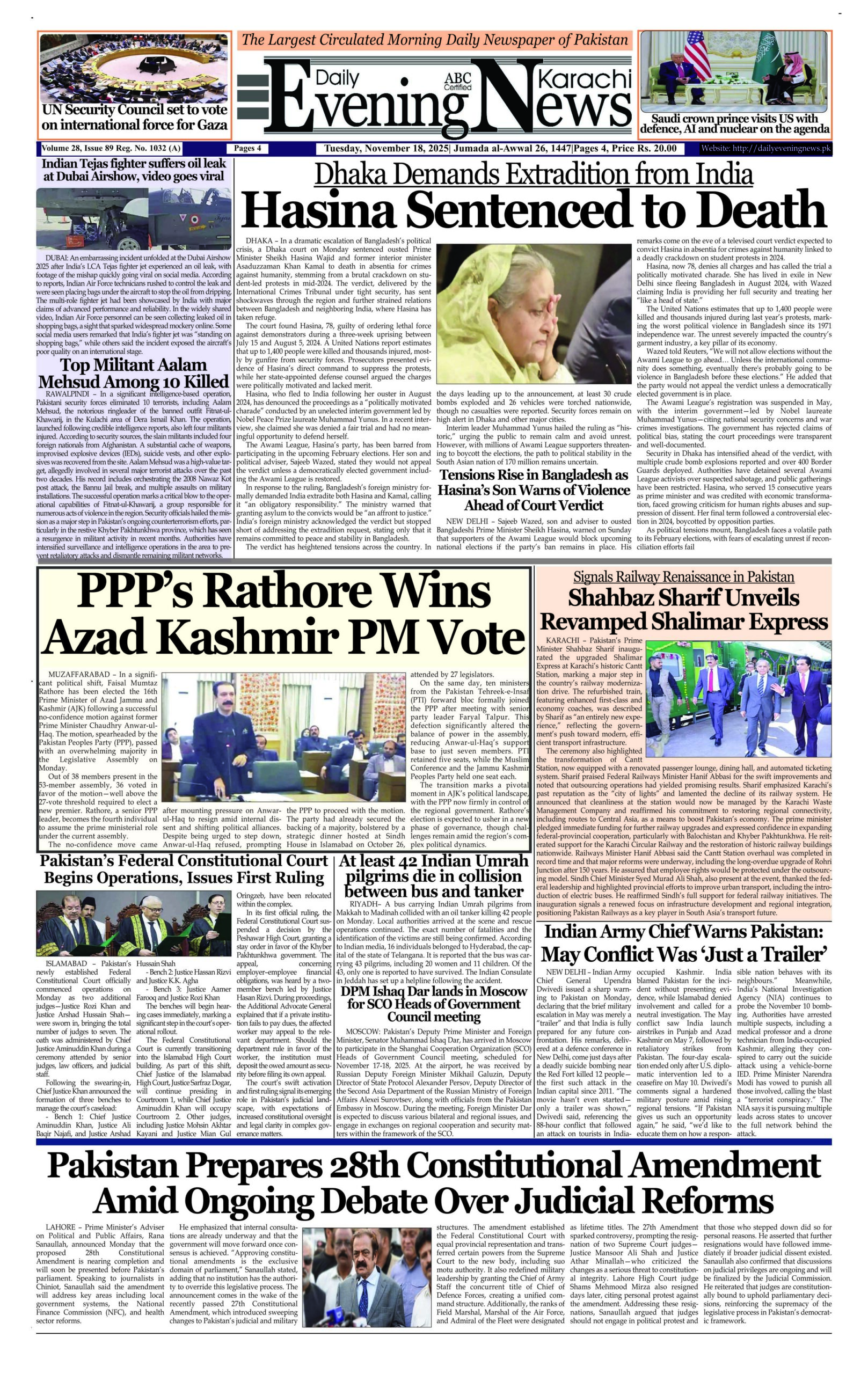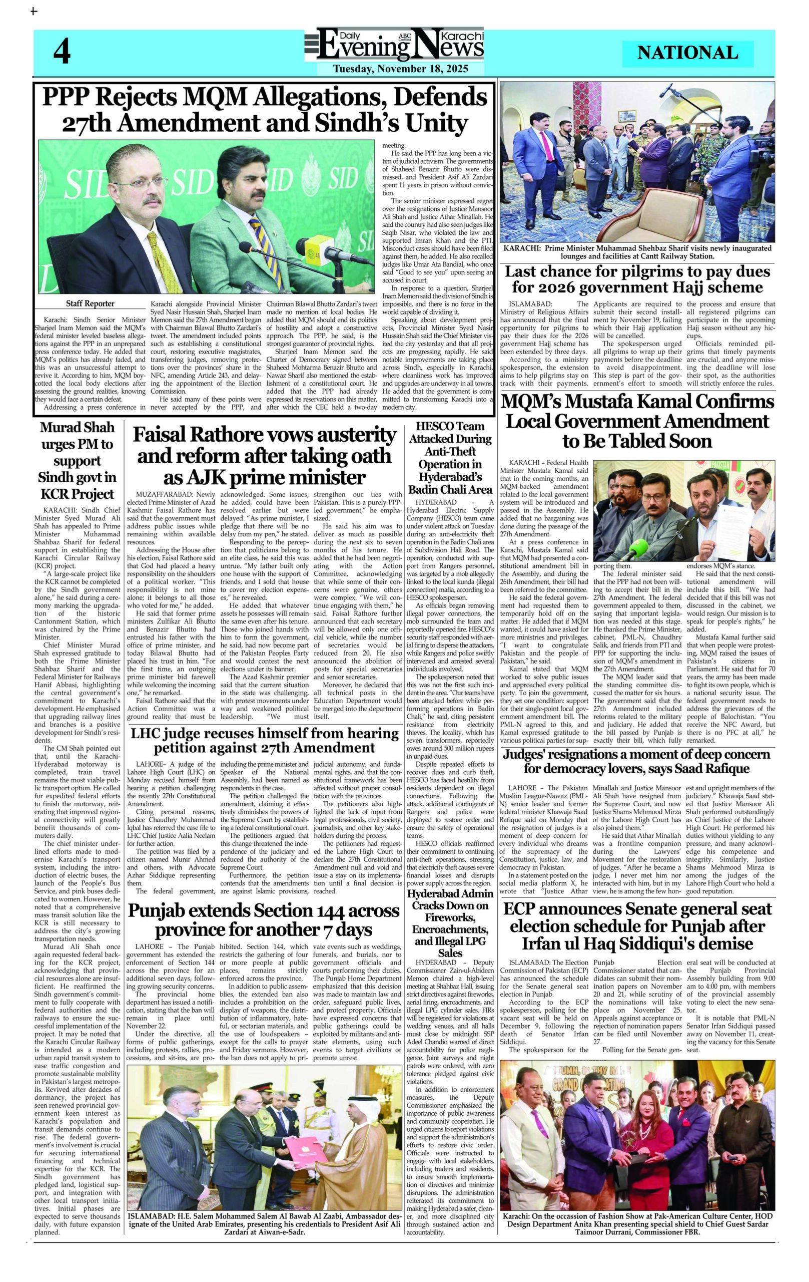 ePaper Tuesday November 18,2025 By: admin Date: November 18, 2025 TagsDaily Evening Newsepaper Previous articleKarachi Police Nab Injured Robber, Accomplice EscapesNext articleSecurity forces kill 15 Indian proxy terrorists in KP operations adminhttps://dailyeveningnews.pk LEAVE A REPLY Cancel reply Comment: Please enter your comment! Name:* Please enter your name here Email:* You have entered an incorrect email address! Please enter your email address here Website: Save my name, email, and website in this browser for the next time I comment. Share post: FacebookTwitterPinterestWhatsApp SubscribeI want inI've read and accept the Privacy Policy. Popular Lebanon Says President Will Not Speak to Israeli PM Netanyahu Pope Leo Warns World Controlled by ‘Cruel Leaders’ Israeli Airstrikes Destroy Last Bridge Linking South Lebanon PSL 11: Hyderabad Kings Beat Rawalpindi by 5 Wickets Pakistan to Reduce Power Load Shedding From Tonight: Federal Minister More like thisRelated Lebanon Says President Will Not Speak to Israeli PM Netanyahu admin - April 16, 2026 Beirut, Lebanon – Web Desk: Lebanese authorities have confirmed... Pope Leo Warns World Controlled by ‘Cruel Leaders’ admin - April 16, 2026 Yaoundé, Cameroon – Web Desk: Catholic Church leader Pope... Israeli Airstrikes Destroy Last Bridge Linking South Lebanon admin - April 16, 2026 Beirut, Lebanon – Web Desk: Israeli airstrikes have destroyed... PSL 11: Hyderabad Kings Beat Rawalpindi by 5 Wickets admin - April 16, 2026 Karachi, Pakistan – Web Desk: In the 11th edition...