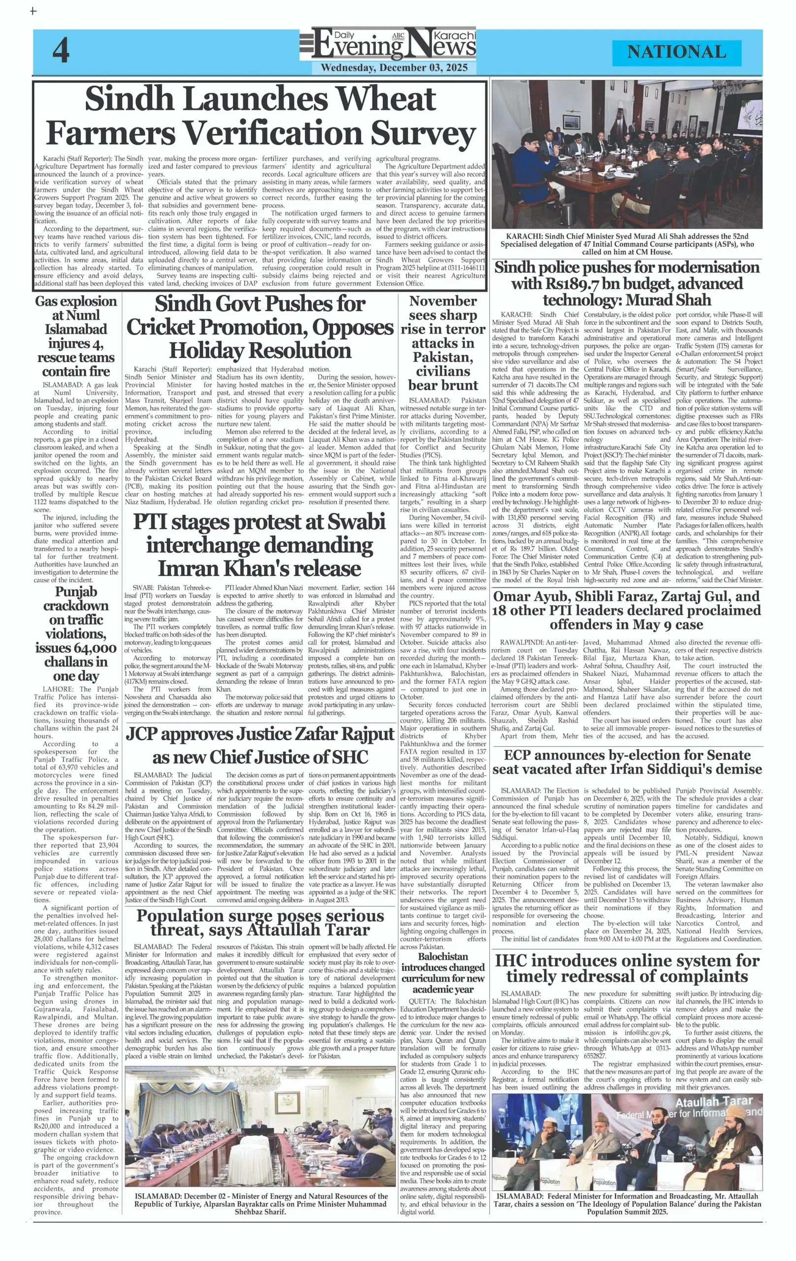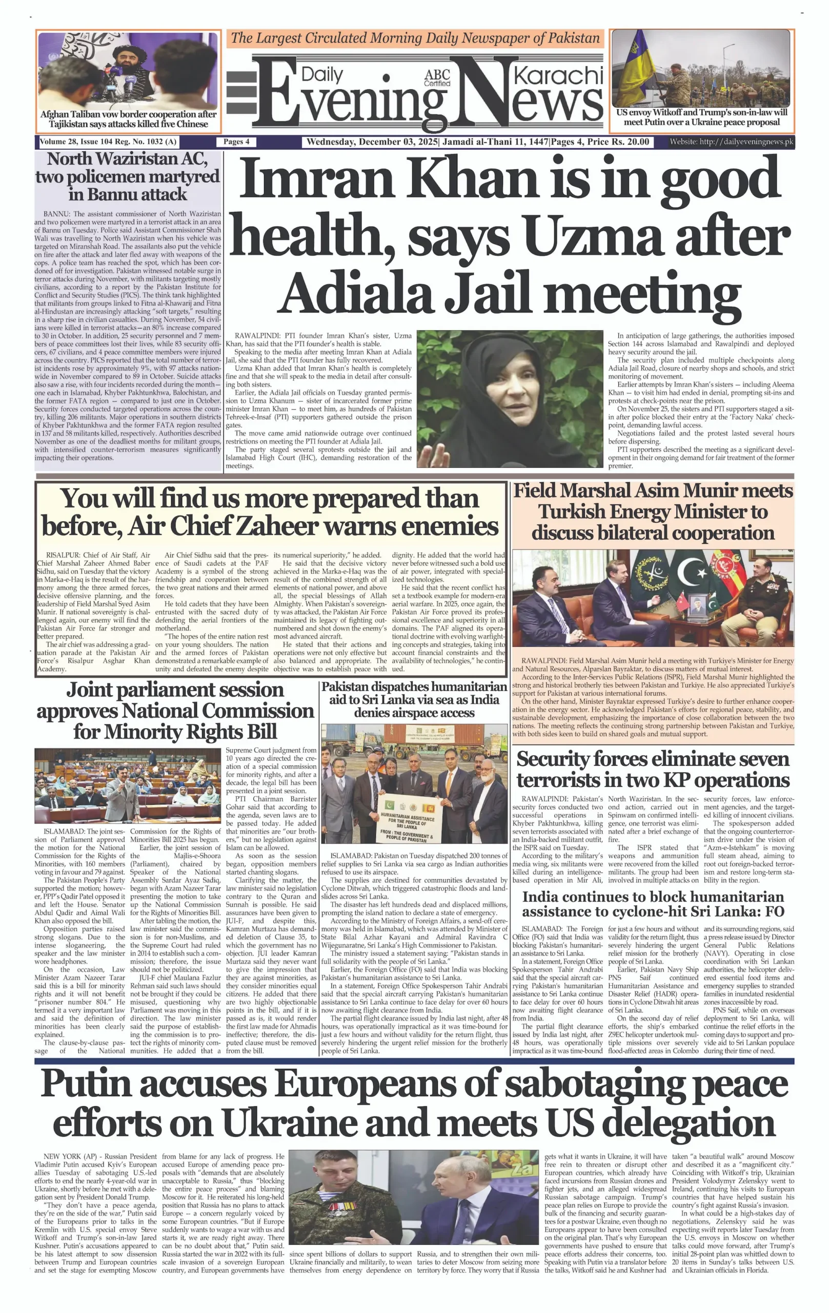 ePaper Wednesday December 3, 2025 By: admin Date: December 3, 2025 Tagsepaper Previous articleAnother Incident in Karachi: Child Falls into Open ManholeNext articlePakistan prefers dialogue, diplomacy for dispute resolution, says Dar adminhttps://dailyeveningnews.pk LEAVE A REPLY Cancel reply Comment: Please enter your comment! Name:* Please enter your name here Email:* You have entered an incorrect email address! Please enter your email address here Website: Save my name, email, and website in this browser for the next time I comment. Share post: FacebookTwitterPinterestWhatsApp SubscribeI want inI've read and accept the Privacy Policy. Popular Lebanon Says President Will Not Speak to Israeli PM Netanyahu Pope Leo Warns World Controlled by ‘Cruel Leaders’ Israeli Airstrikes Destroy Last Bridge Linking South Lebanon PSL 11: Hyderabad Kings Beat Rawalpindi by 5 Wickets Pakistan to Reduce Power Load Shedding From Tonight: Federal Minister More like thisRelated Lebanon Says President Will Not Speak to Israeli PM Netanyahu admin - April 16, 2026 Beirut, Lebanon – Web Desk: Lebanese authorities have confirmed... Pope Leo Warns World Controlled by ‘Cruel Leaders’ admin - April 16, 2026 Yaoundé, Cameroon – Web Desk: Catholic Church leader Pope... Israeli Airstrikes Destroy Last Bridge Linking South Lebanon admin - April 16, 2026 Beirut, Lebanon – Web Desk: Israeli airstrikes have destroyed... PSL 11: Hyderabad Kings Beat Rawalpindi by 5 Wickets admin - April 16, 2026 Karachi, Pakistan – Web Desk: In the 11th edition...
